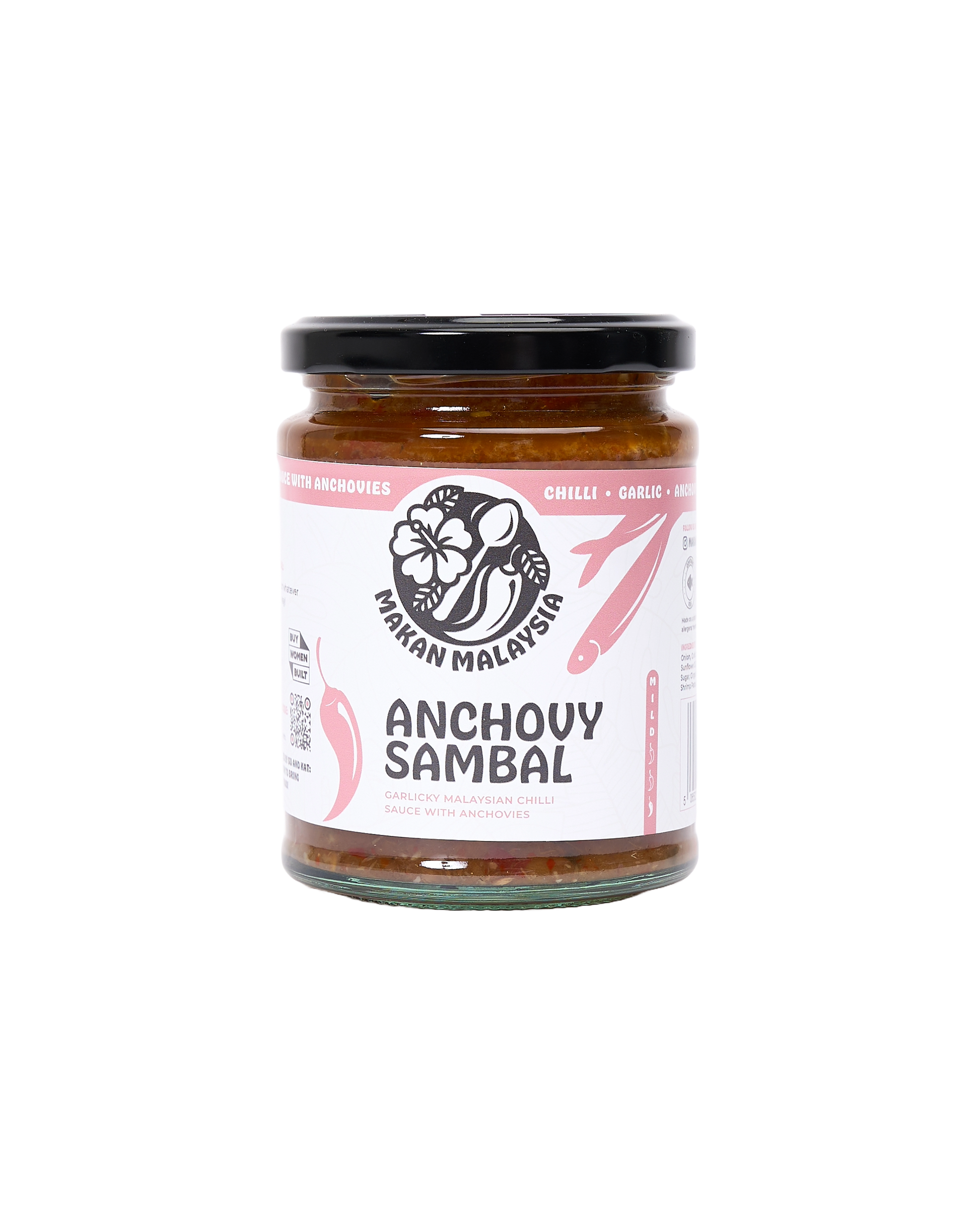 MAKAN MALAYSIA, ANCHOVY & BELACAN SAMBAL: A rich, savoury chilli sauce made with whole anchovies and belacan for deep umami flavour. Balanced with tamarind and garlic, this is the mildest sambal in the range. Pour generously over rice, especially with Nasi Lemak.
