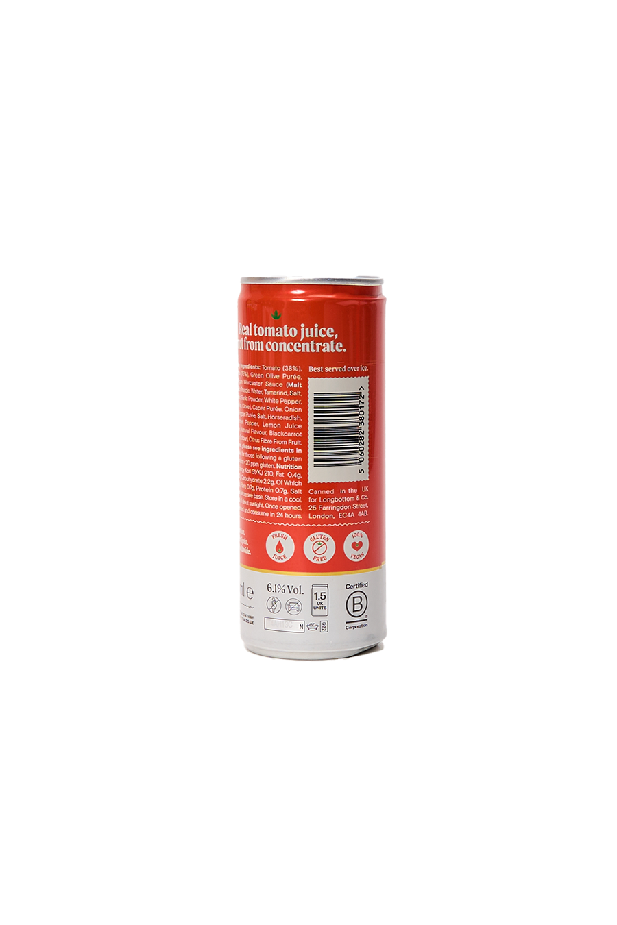 Longbottom & Co. Bloody Mary uses their signature Virgin Mary, and adds a good slug of premium vodka. A modern classic, ready to drink, anytime. They use only real tomatoes in the cans, squeezed within two hours of where they are picked for maximum freshness. It might seem obvious, but you won’t find anyone else canning proper tomato juice. 6.1% abv