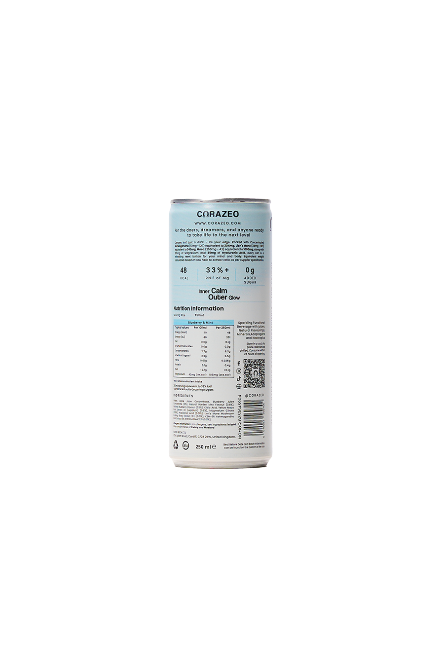 CORAZEO is a clean-label sparkling wellness drink crafted to help you feel sharp, calm, and energised. Juicy blueberry and cool mint are blended with Ashwagandha for stress and hormone support, Lion’s Mane for focus, Maca for natural energy, Magnesium for recovery, and Hyaluronic Acid for skin hydration. Vegan, gluten-free, with zero added sugar or artificial sweeteners and only 48 calories, it’s clean, functional, and refreshing.
