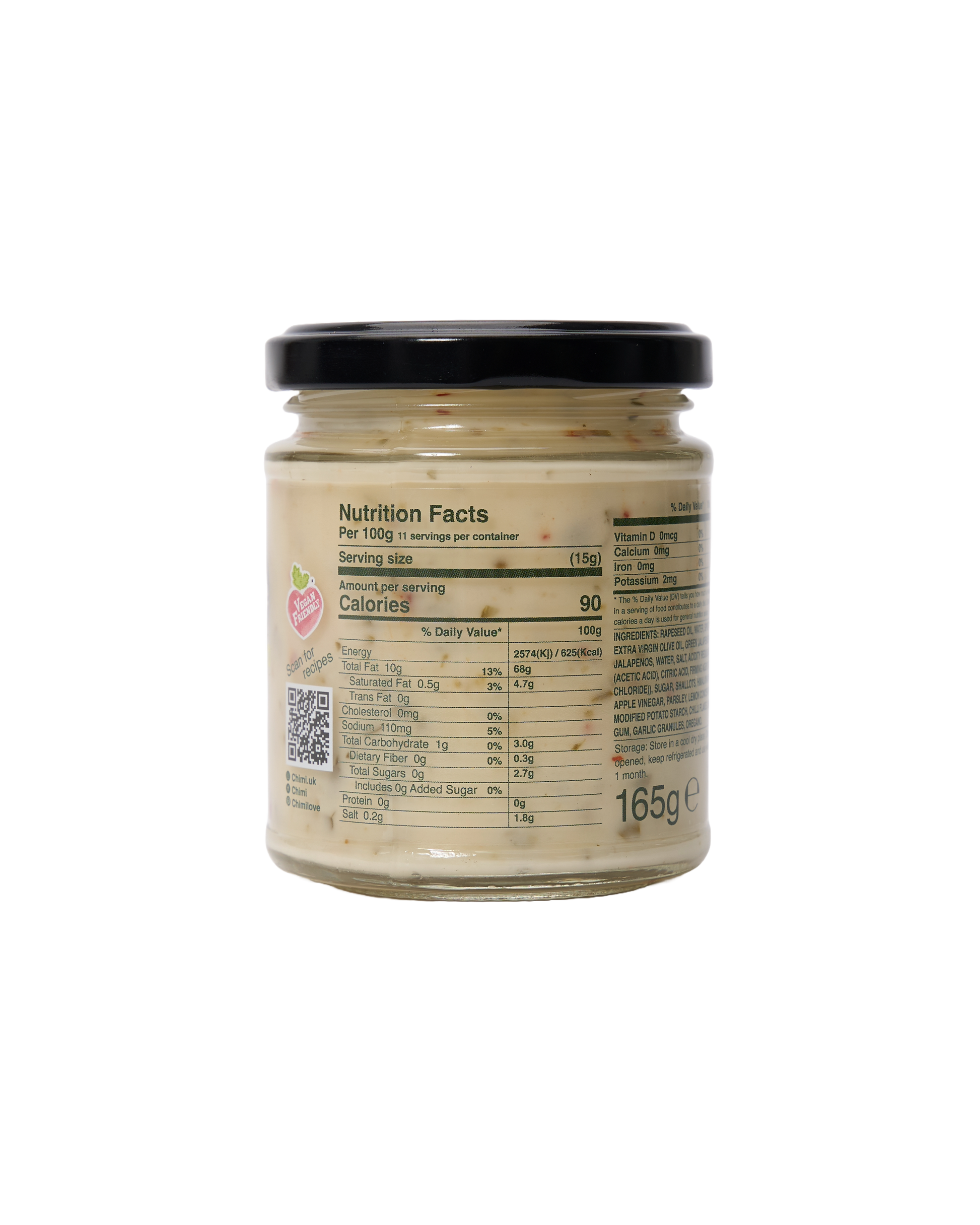 Rapeseed Oil, Water, Spirit Vinegar, Extra Virgin Olive Oil, Green Jalapeños (Green Jalapeños, Water, Salt, Acidity Regulator (Acetic Acid), Citric Acid, Firming Agent (Calcium Chloride)), Sugar, Shallots, Apple Vinegar, Himalayan Pink Salt, Potato Starch, Parsley, Lemon Juice Concentrate, Xanthan Gum, Chilli Flakes, Garlic Powder, Oregano
