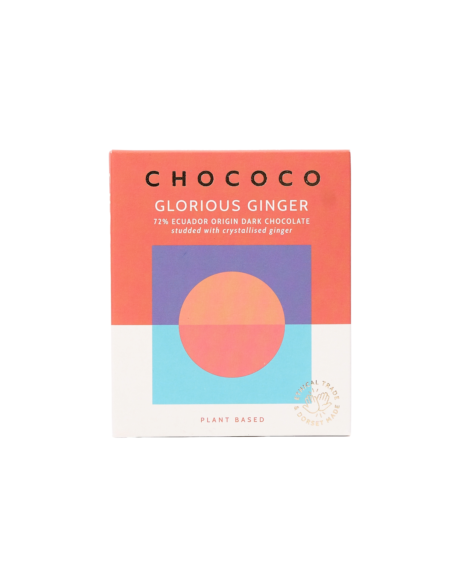 Chococo is a Dorset-based chocolatier that creates artisan chocolates celebrating quality and sustainability. Chococo's 72% Ecuador Glorious Ginger is a dark chocolate bar infused with crystallised ginger, made from ethically-sourced Ecuadorian cacao. It has a rich, deep cocoa flavor with warming, spicy-sweet ginger pieces that add a lively contrast and subtle heat. Enjoy it on its own, or pair it with dark coffee or red wine to complement the bold flavors, perfect for a sophisticated dessert or snack.