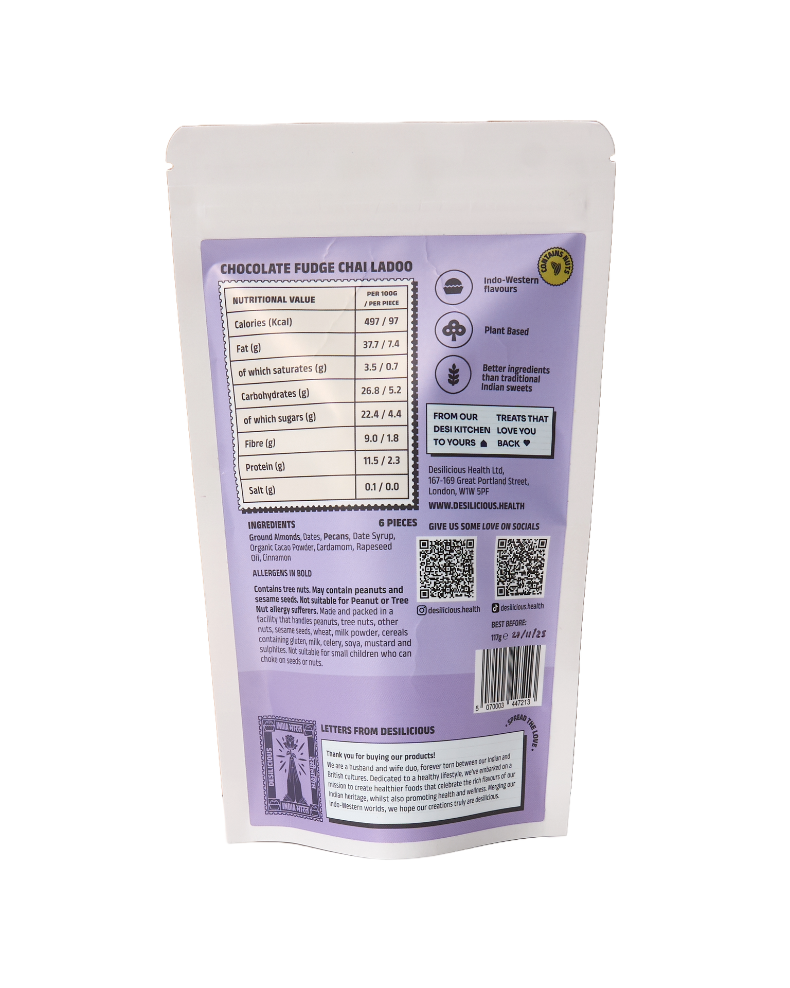 A rich blend of chocolate and warming chai spices, this refined sugar-free laddoo is sweetened naturally with dates. Vegan, high in fibre, and lower in calories, it’s a modern take on a traditional Indian treat. A comforting, feel-good snack with no sugar crash and no compromise on flavour. One pack contains 6 pieces.