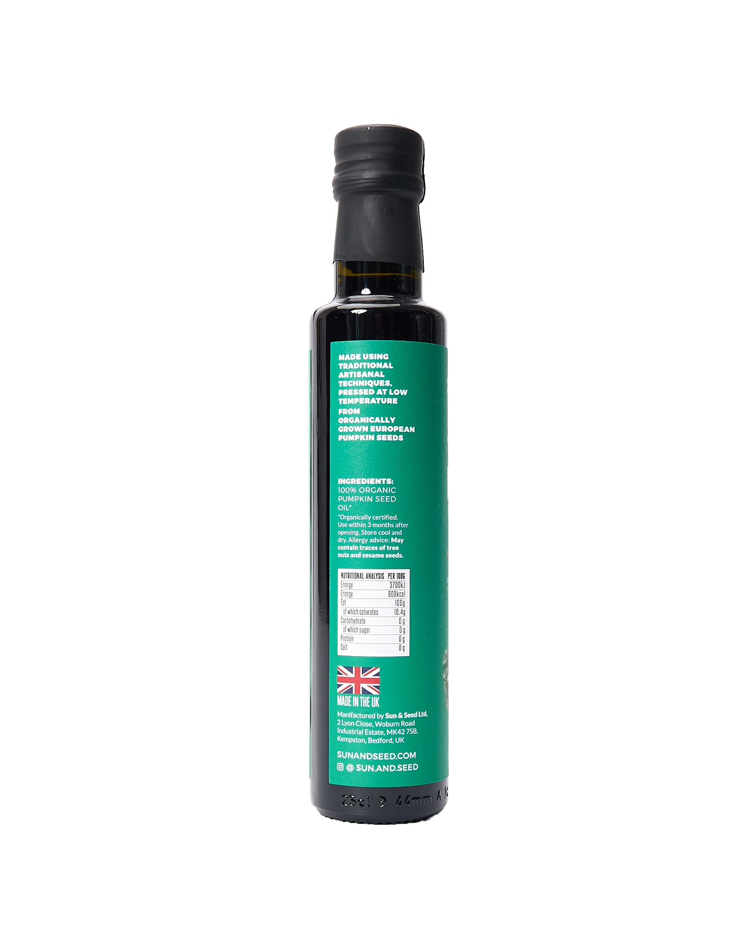 Meet your new kitchen hero: Pumpkin Seed Oil. Cold-pressed from raw pumpkin seeds, it’s packed with Vitamin E, Omega-3 & 6, plus minerals like zinc and magnesium—pure nutrition in every drop. Mild, nutty, and delightfully smooth, it’s perfect drizzled over salads, stirred into dressings, or dipped with fresh bread. A simple way to boost your meals with nature’s best. Suitable for vegans and vegetarians.