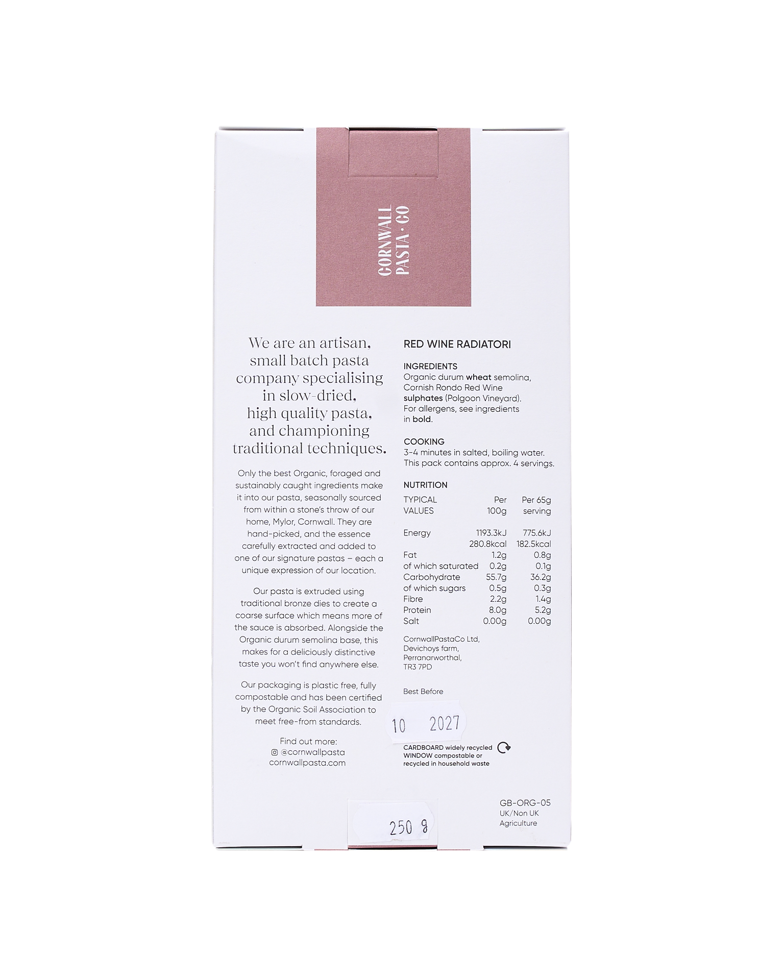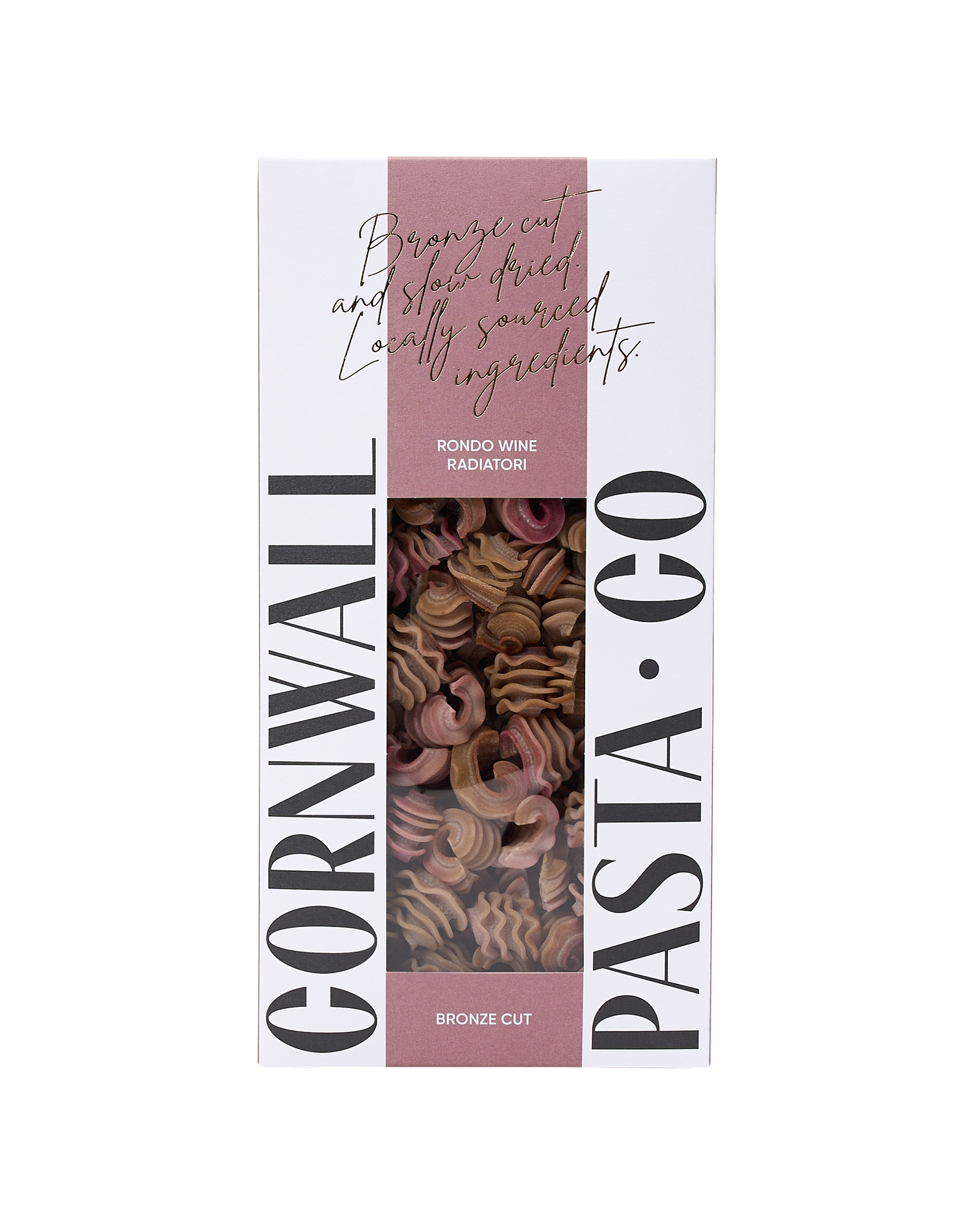 Cornwall Pasta Co is an organic British pasta company dedicated to creating better pasta through sustainable, regenerative farming practices. Their Red Wine Radiatori is crafted with organic flour and a single-variety red wine from Rondo grapes, to create a striking pasta. The rich, earthy taste of red wine makes this variety perfect for wintry dishes. Serve it with a simple olive oil or butter sauce to let the wine flavour shine, or pair with rich meat sauces and ragus for a fuller experience.