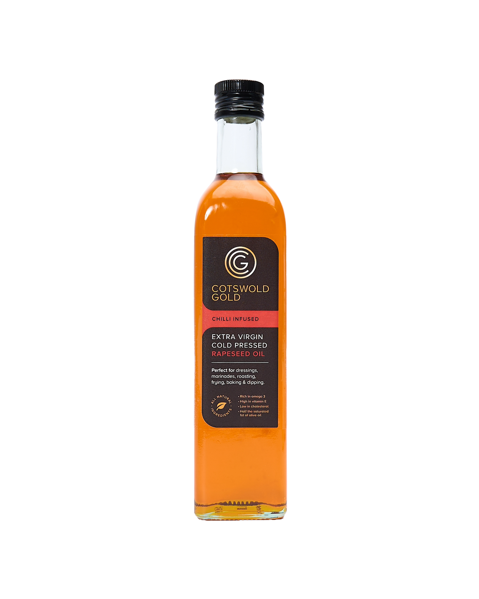 Cotswold Gold's Rapeseed Oil is the perfect kitchen cupboard staple. A premium, extra virgin rapeseed oil made using traditional cold pressing methods and infused with chilli for an extra kick. The make this using crops grown on their family farm in the Cotswolds because this ensures that only the finest seeds are pressed. The resulting oil is a beautiful orange colour. With a high smoke point it is perfect for searing meats and it's nutty flavour makes it great drizzled over salad.