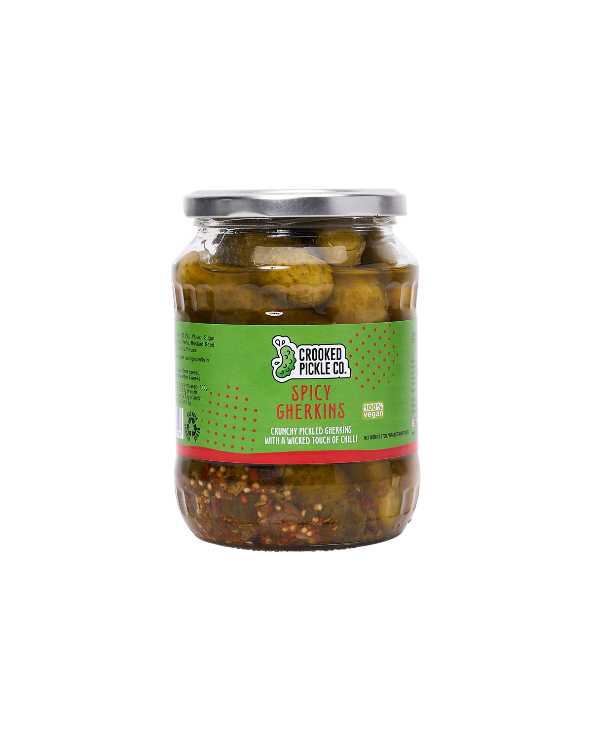 Spicy, crunchy, tangy whole gherkins that are delicious to snack straight from the jar, or pair with a chunk of smoky gouda, smash burger, barbecues, or dipped into creamy hummus.
