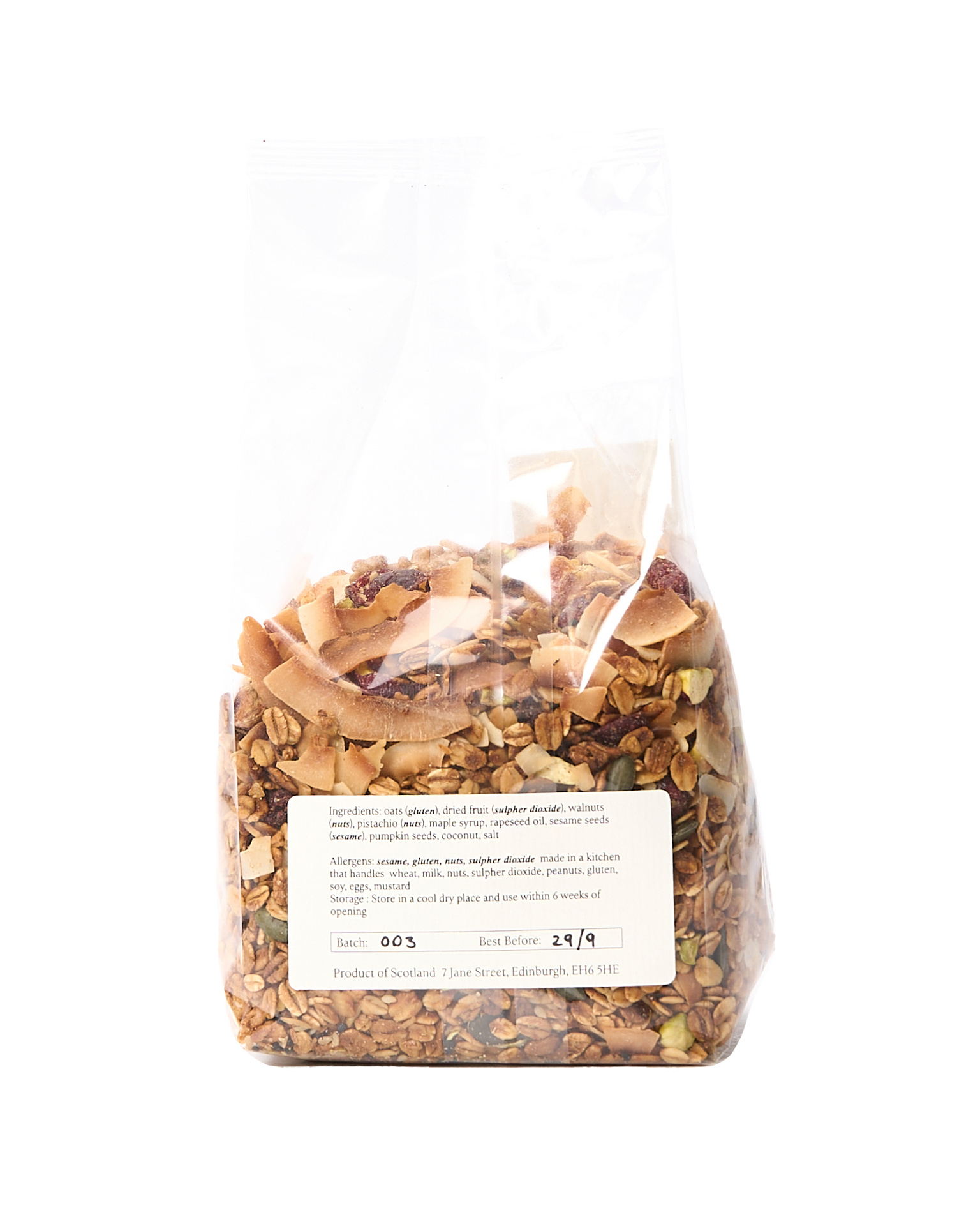 Twelve Triangles present their classic granola. This one is a mix of pistachios, coconut, oats & fruit; lightly toasted, and sweetened with maple syrup. This is the perfect granola for a quick breakfast or even afternoon snack! Add it into your yoghurts for a more substantial breakfast.