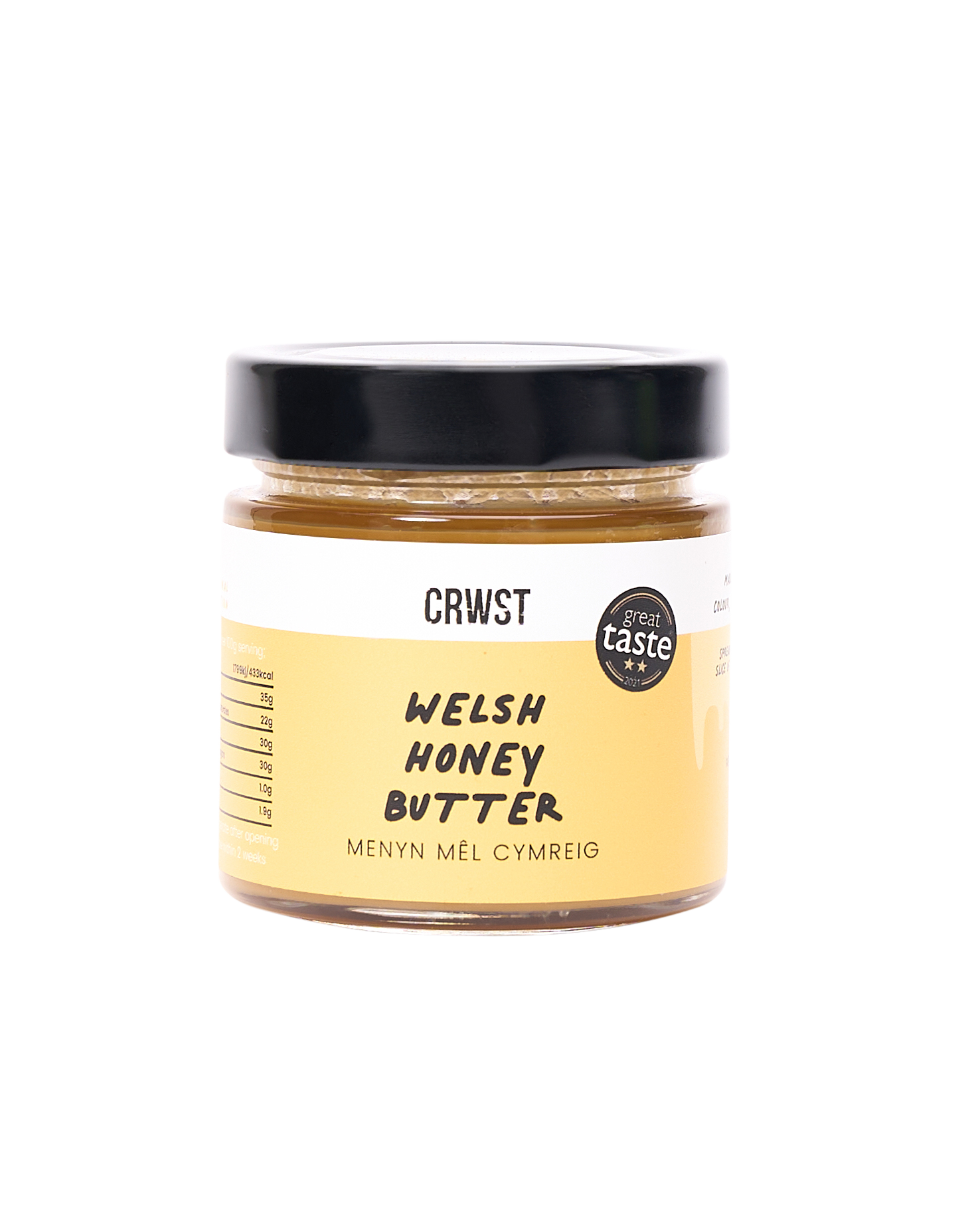 Crwst specialise in creating indulgent small-batch, handmade Welsh spreads, sauces and pantry products using recipes from their bakery. This Welsh Honey Butter is a creamy blend of rich butter and pure Welsh honey, crafted to enhance both sweet and savory dishes. It contains just four simple ingredients, that combine to create a smooth, luscious texture and a balance of floral sweetness and buttery richness. Perfect for spreading on toast, drizzling over warm pancakes, or adding a touch of luxury to roasted vegetables.