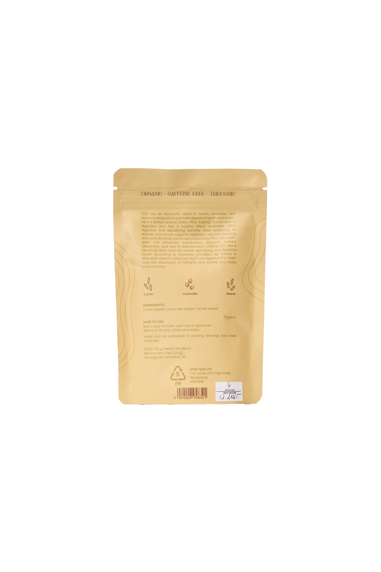 Vital Ojas crafts this traditional Ayurvedic blend of cumin, coriander, and fennel, treasured for centuries for its powerful digestive and detoxifying properties. It supports your body's natural balance, easing bloating and promoting healthy digestion. It's anti-inflammatory and antioxidant properties contribute to weight management, skin health, and overall well-being.