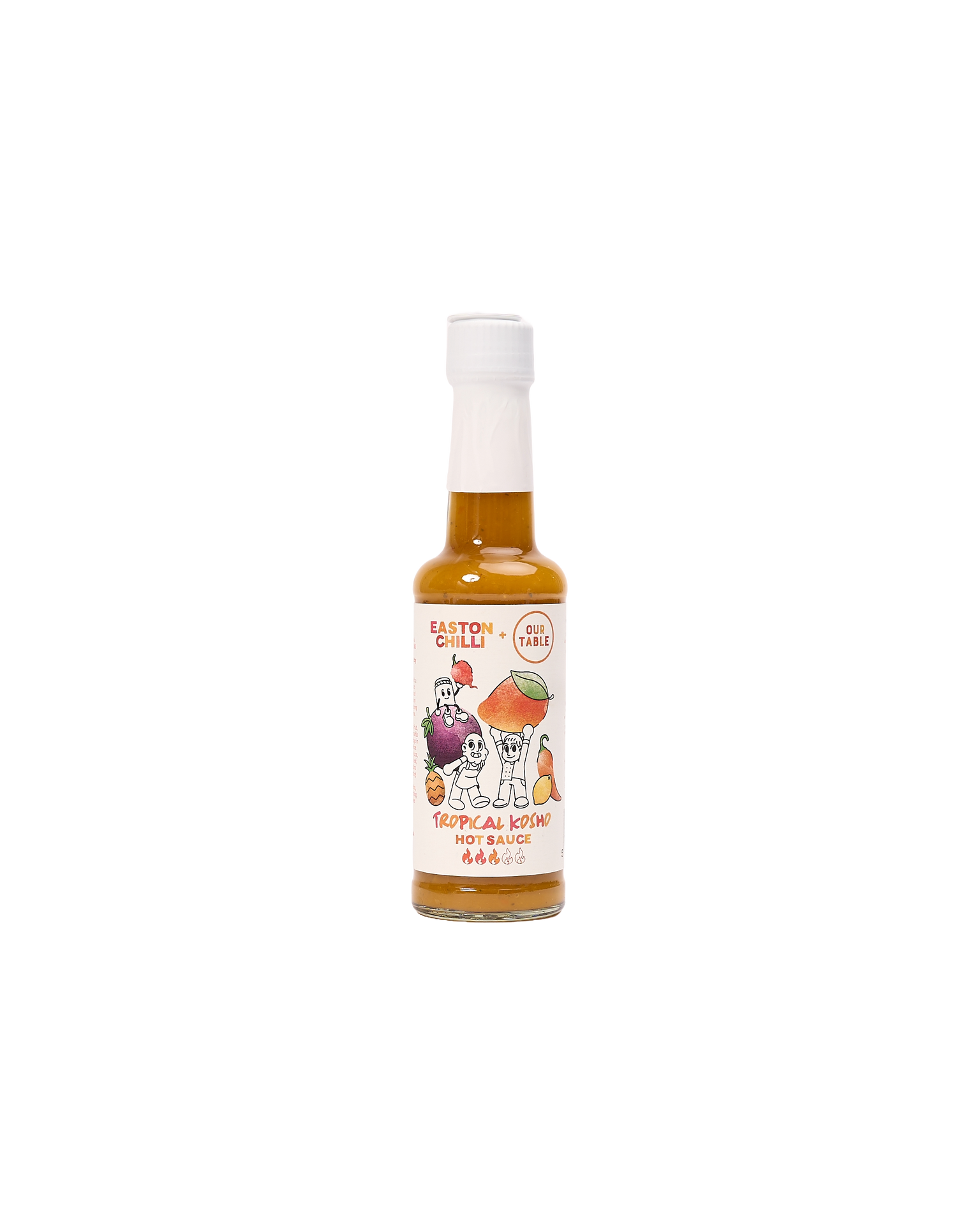 Easton Chilli was founded by chilli jam home cook Rikki in Bristol. This hot sauce is in collaboration with fine-dining chefs Kasae Fraser and Vincent Gatay from Our Table! The hot sauce is made with fermented mango, passion fruit, lemon and Peruvian aji amarillo chillies. The ingredients are left to salt for just a few days in the Japanese kosho style, before blending with sweet pineapple juice, Australian lemon myrtle leaf, and a touch of fiery carolina reaper. The flavours are inspired by Kasae and Vincent's international culinary careers as well as their love for exploring new countries in the sunshine. Goes great with BBQ meats, fish, avo & eggs.