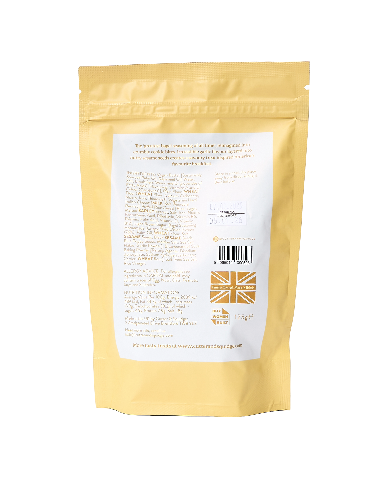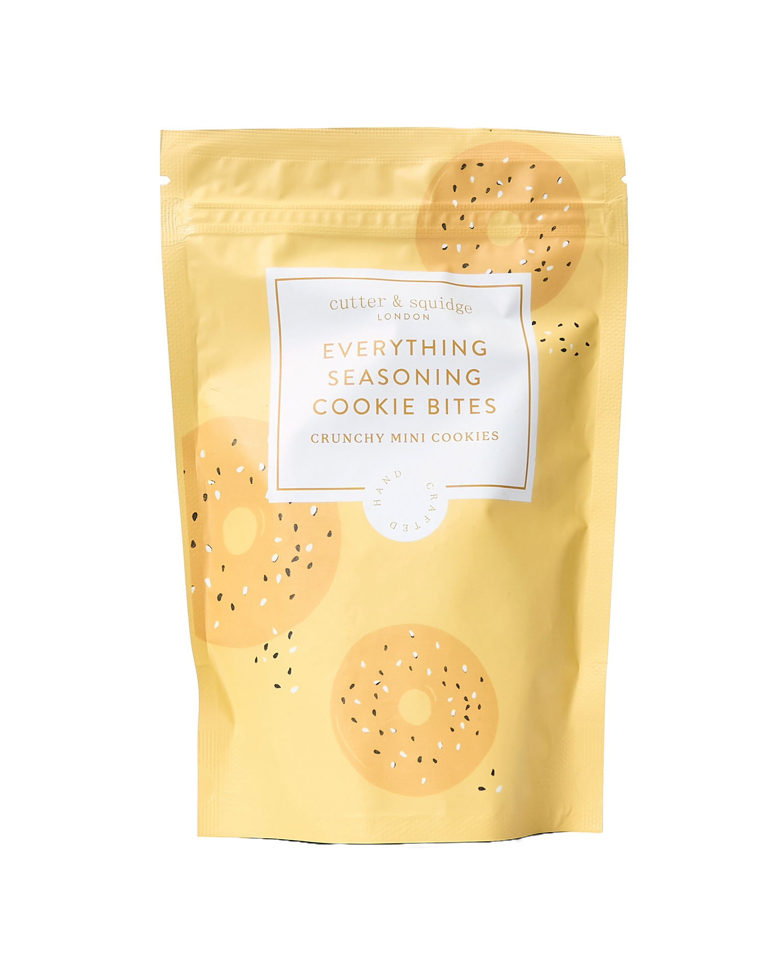 Cutter & Squidge was founded in 2014 by Annabel & Emily, sisters with a passion for creating utterly indulgent treats that are as delightful to look at as they are to devour. From their London bakery they hand craft a range of cakes, brownies and other baked treats. This is their reimagining of the infamous bagel seasoning into cookie bites. They have an resistible garlic flavour layered into nutty sesame seeds to create a savoury treat inspired America’s favourite breakfast!