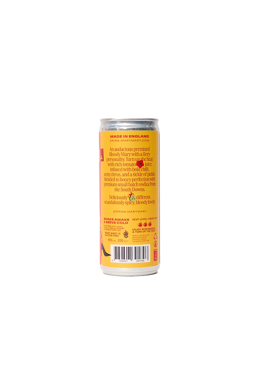 MARY MARY creates an audacious premixed Bloody Mary with a fiery personality. Every gutsy gulp delivers intense tomato flavors that are bright, zesty, and hotter than your date. Expect a smack of citrus, a crack of pepper, and a cheeky pickle tickle, all blended to boozy perfection with premium small-batch vodka from the South Downs. They handcraft each batch individually, creating a drink that's deliciously different, scandalously spicy, and bloody lovely. ABV: 15.0%