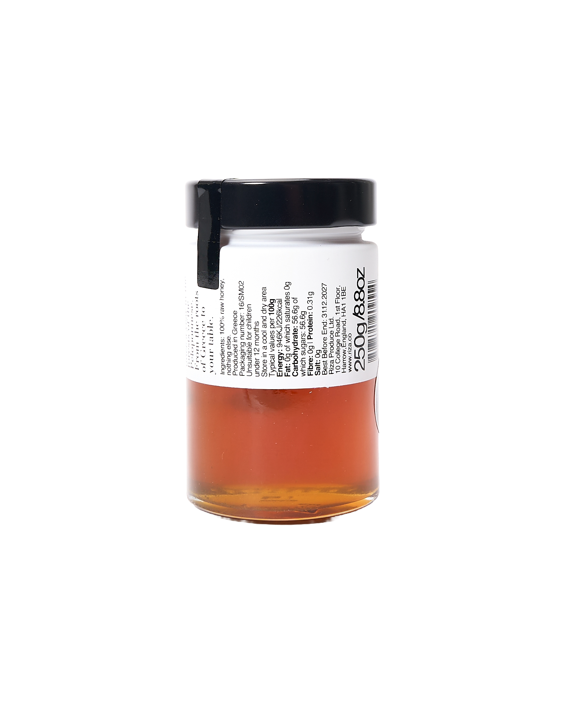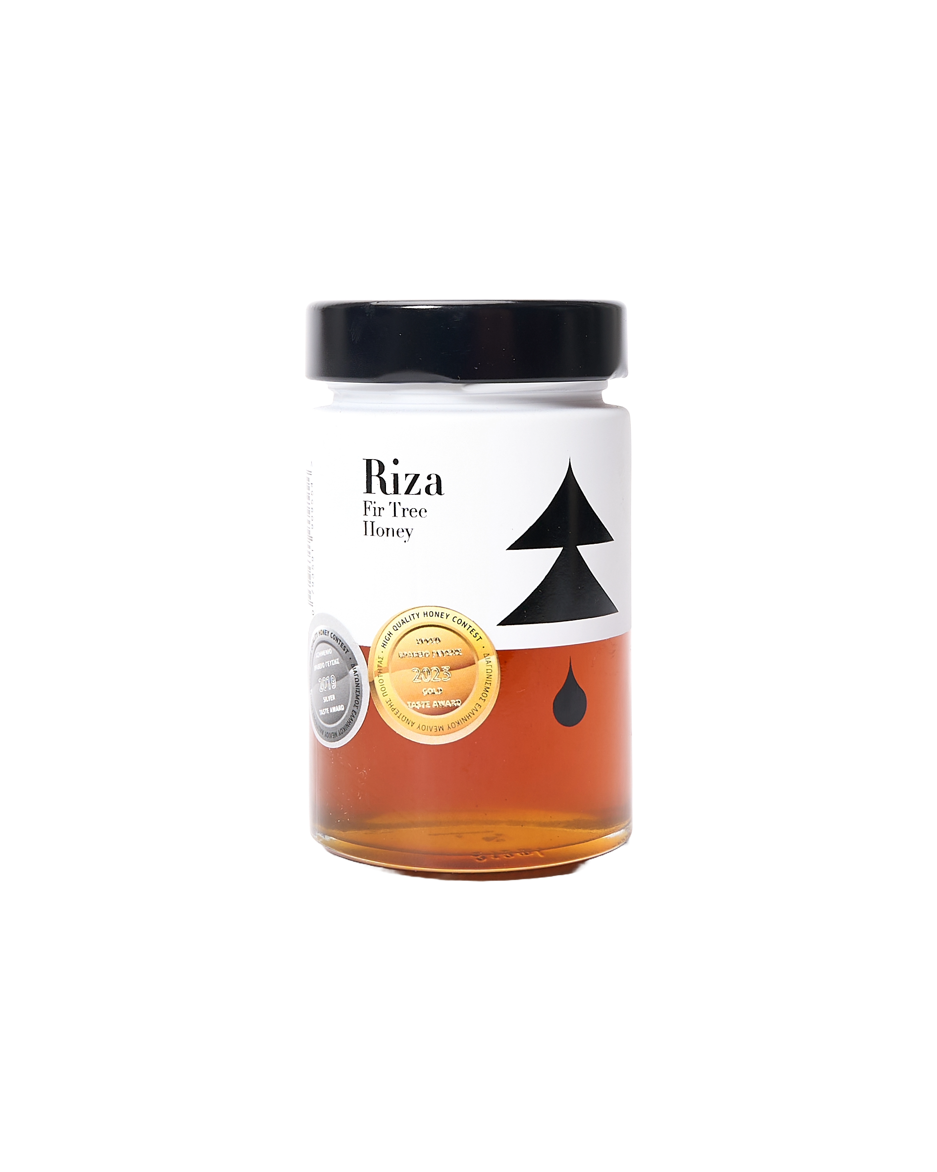 Riza's raw and unfiltered Fir Tree Honey is produced once a year in the Peloponnese forests at 1100 m by Vasilis and Sotiris. Thick and creamy with caramel and citrus notes, it earned Silver and Gold European Taste Awards. Low in glucose, it never crystallizes. Perfect drizzled over Greek yogurt, fruits, nuts, or cheese, it is the only Greek honey with Protected Designation of Origin (PDO) status.