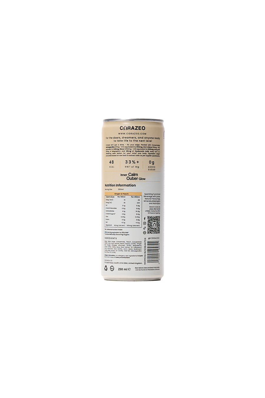 CORAZEO is a clean-label sparkling wellness drink designed to help you feel sharp, calm, and energised. This Ginger & Peach flavour balances gentle ginger spice with juicy peach, while Ashwagandha supports stress, Lion’s Mane aids focus, Maca boosts energy, Magnesium aids recovery, and Hyaluronic Acid supports skin hydration. Vegan, gluten-free, with zero added sugar or artificial sweeteners and only 48 calories.