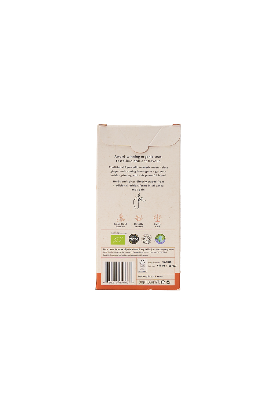 Joe’s Tea blends traditional Ayurvedic turmeric with ginger and calming lemongrass for a cup that’s both comforting and invigorating. Warming spices meet soothing herbs, all directly traded from ethical farms in Sri Lanka and Spain. Naturally caffeine-free.