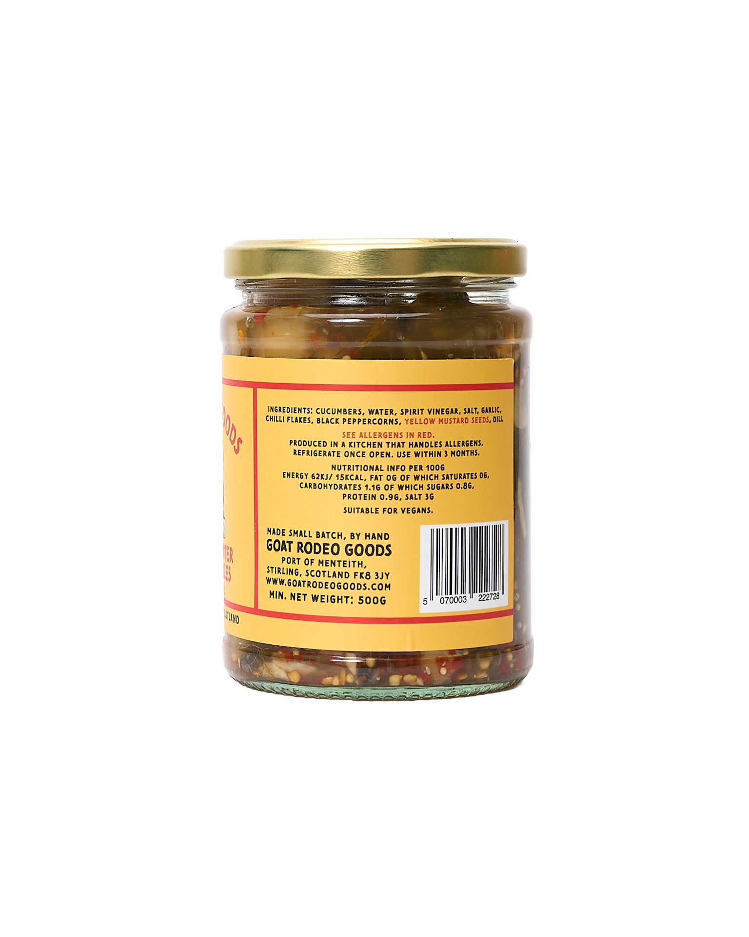 Goat Rodeo Goods offers bold, playful pickles and seasonings, turning surplus crops into vibrant flavours that make seasonal cooking exciting and fun. The Hell or High Water Pickles are bold cucumber spears in a fiery brine of red chilies, garlic, dill, mustard, and black pepper. Perfect for leveling up hotdogs, adding crunch to salads, or wrapping in salami for a quick snack. Even the brine doubles as a killer base for Bloody Marys.