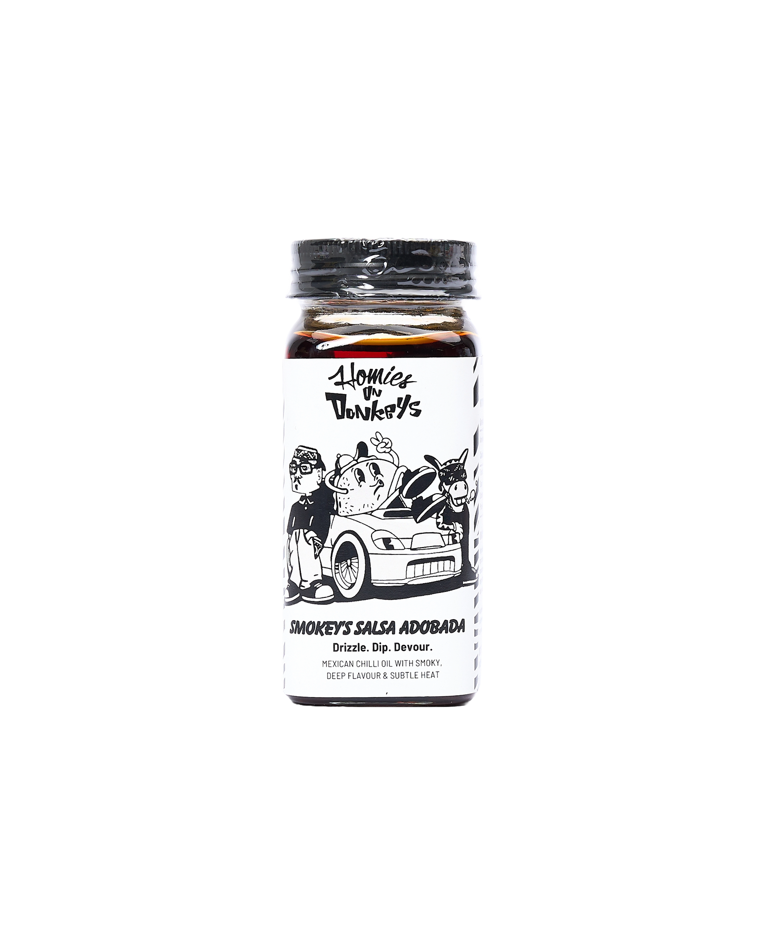 Smokey’s Salsa Adobada is salsa macha’s refined cousin, rich and deep with bold Mexican adobo spices. It’s free from allergens but full of pure, addictive flavour. The smoky warmth of roasted guajillo chillies blends with mellow garlic and a touch of brown sugar to balance the heat, while liquid aminos and umami powder add even more depth. It’s not an overpowering spice, just a slow, satisfying warmth that lingers. Drizzle it over tacos, grilled meats, or roasted vegetables, swirl it into soups and marinades, or spread it on sandwiches.