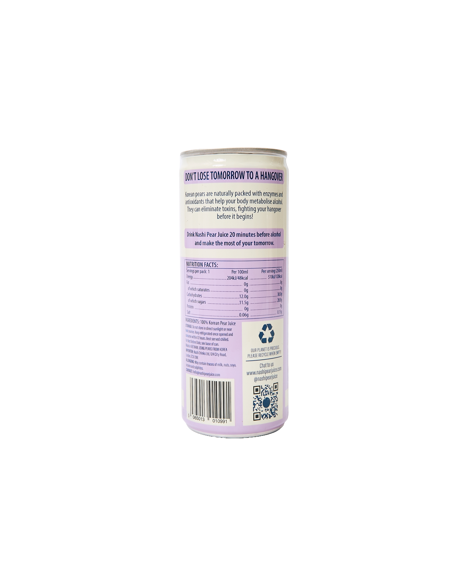 Nashi Korean Pear Juice is the easy, no-nonsense ritual that sets your night up right. Crafted from 100% pure Korean pear juice, it delivers a clean, subtly sweet flavour that’s both refreshing and gentle. Just one can before drinking alcohol helps your body stay supported, so you wake up feeling fresh, clear-headed, and ready to own the day. Rooted in centuries of Korean tradition and now a favourite in the UK, Nashi is all about keeping it natural — no additives, no nonsense. It’s the simple, smart way to enjoy your night without losing tomorrow.