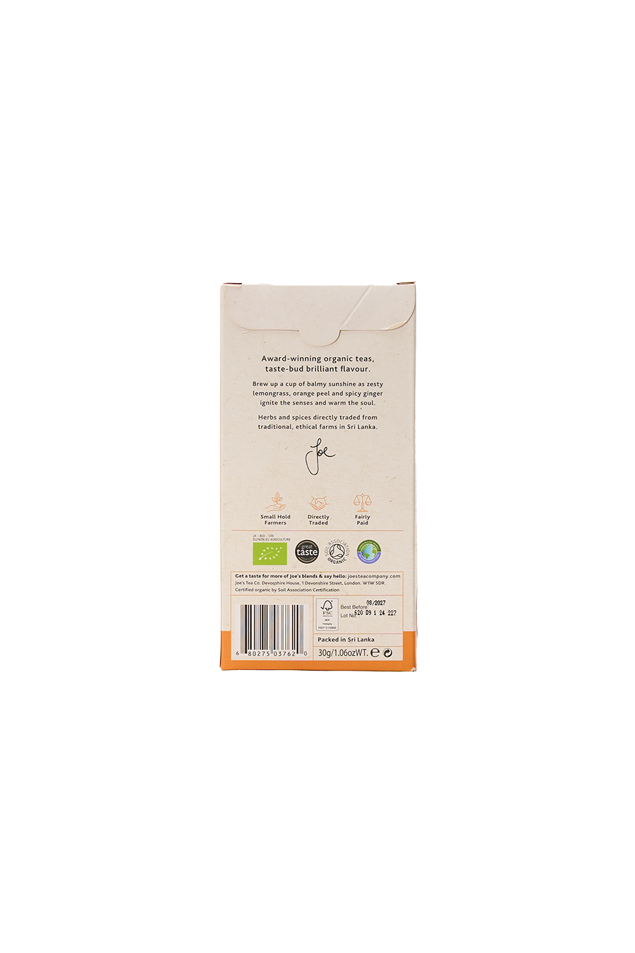 Joe’s Tea creates a bright, citrusy blend that brings sunshine to your cup. Zesty lemongrass, warming ginger, and vibrant orange peel are balanced with a hint of lemon and mandarin oils, delivering a perfect harmony of spicy warmth and refreshing citrus. All ingredients are directly traded from traditional, ethical farms in Sri Lanka.