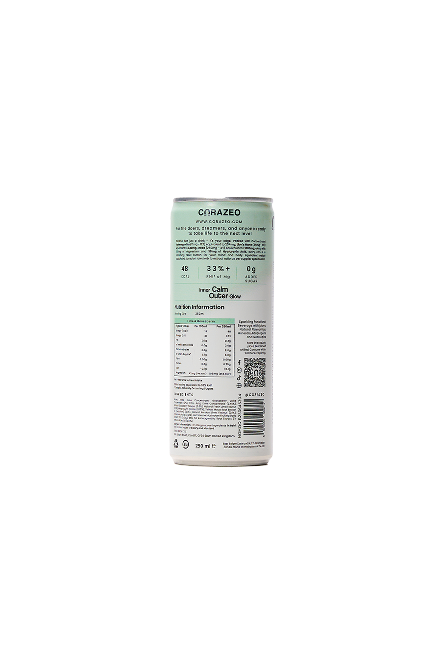 CORAZEO is a clean-label sparkling wellness drink designed to help you feel sharp, calm, and energised. This zesty Lime & Gooseberry flavour is bright, slightly tart, and refreshing, and works well as a mixer with Gin or Vodka. Each can delivers Ashwagandha for stress and hormone support, Lion’s Mane for focus, Maca for natural energy, Magnesium for recovery, and Hyaluronic Acid for skin hydration. Vegan and gluten-free, with zero added sugar or artificial sweeteners and only 48 calories.