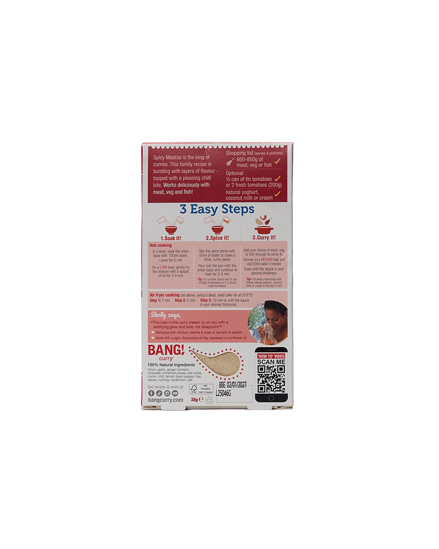 Spicy Madras Curry is the king of curries. This family recipe is bursting with layers of flavour and topped with a pleasing chilli bite. 100% natural and vegan, each pack contains one onion, garlic and ginger sachet, and one spice sachet. Perfect for family dinners or batch cooking with meat, veg or fish.