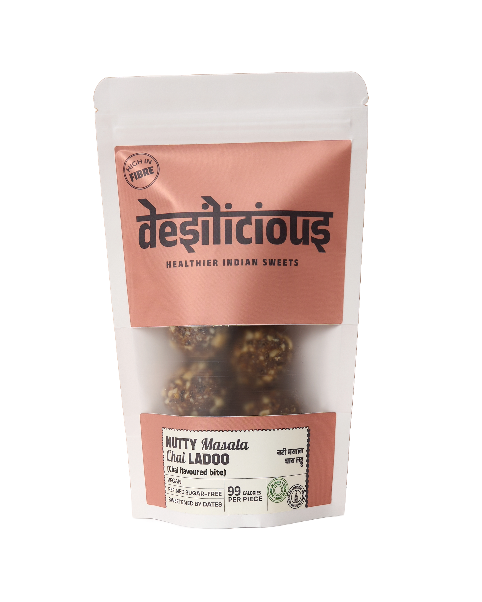 Like an edible cup of Indian chai, this refined sugar-free laddoo is packed with warming spices and naturally sweetened with dates. High in fibre, lower in calories, and completely vegan, it’s a modern twist on a traditional treat. A comforting, feel-good snack with no sugar crash and no compromise on flavour. One pack contains 6 pieces.
