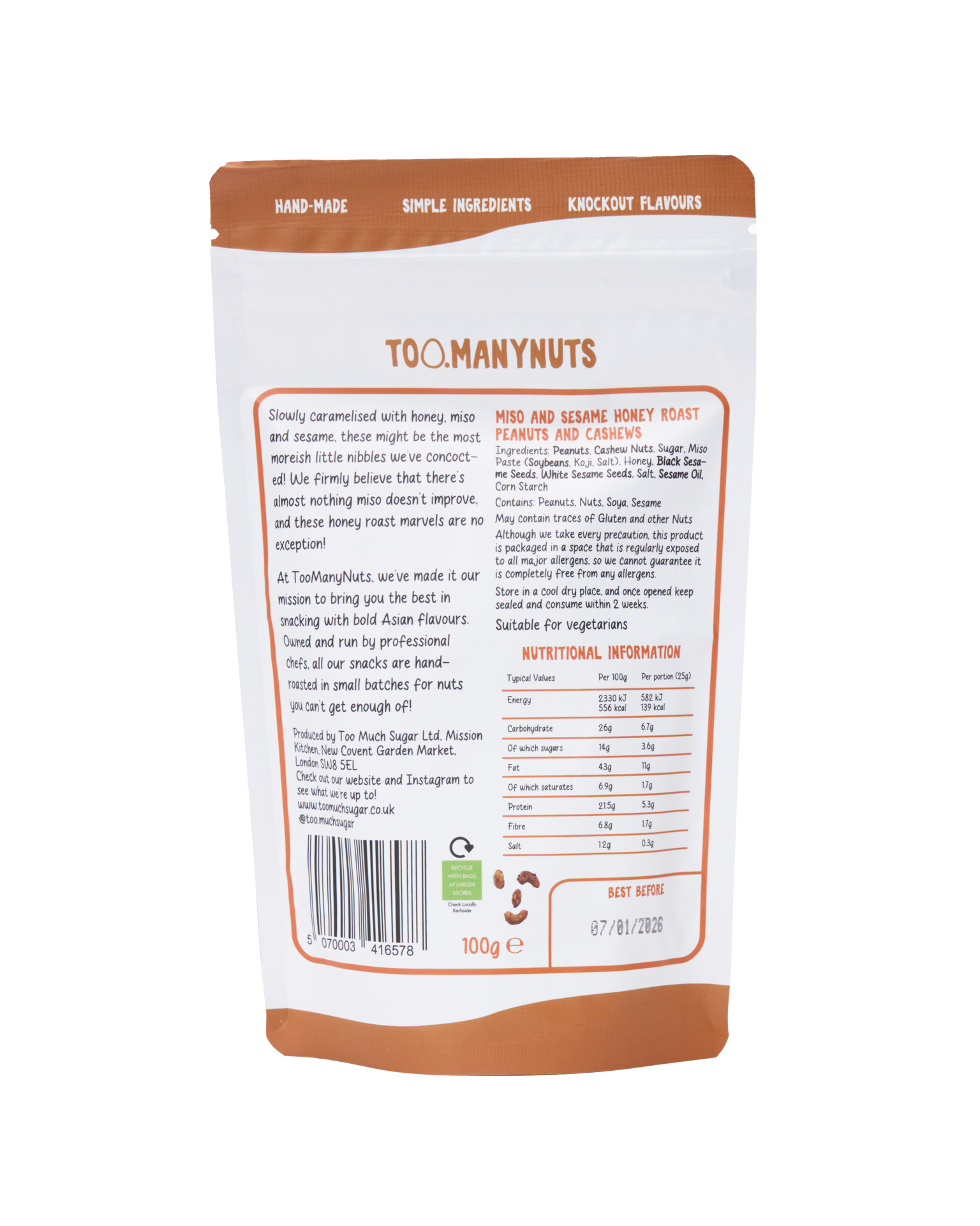 Slow-roasted peanuts and cashews with a sticky-sweet miso, sesame and honey glaze. Sweet, salty and rich in bold umami flavours. Eat straight from the pack or pair with a hot drink.