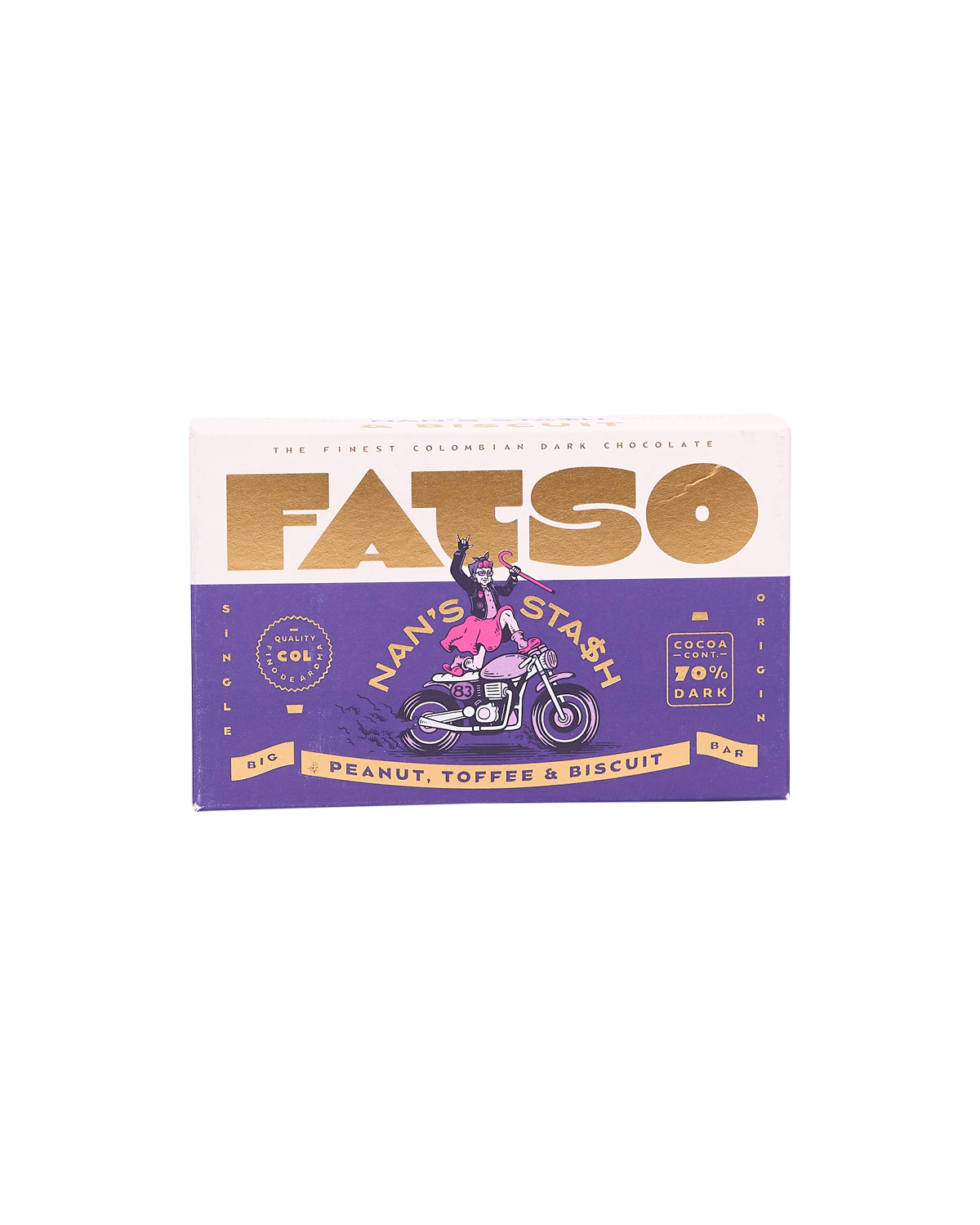 Don’t be fooled by the false teeth & the pearl earrings; Nan's are the ogs of sneaky snacking! So it only seemed right to raid Nan’s Stash in tribute to these old-school fatsos. We’ve swapped the tin for our signature dark chocolate and packed those buttery biscuits, crunchy peanuts & chewy toffee into a bar that nan would demolish – teeth or no teeth!