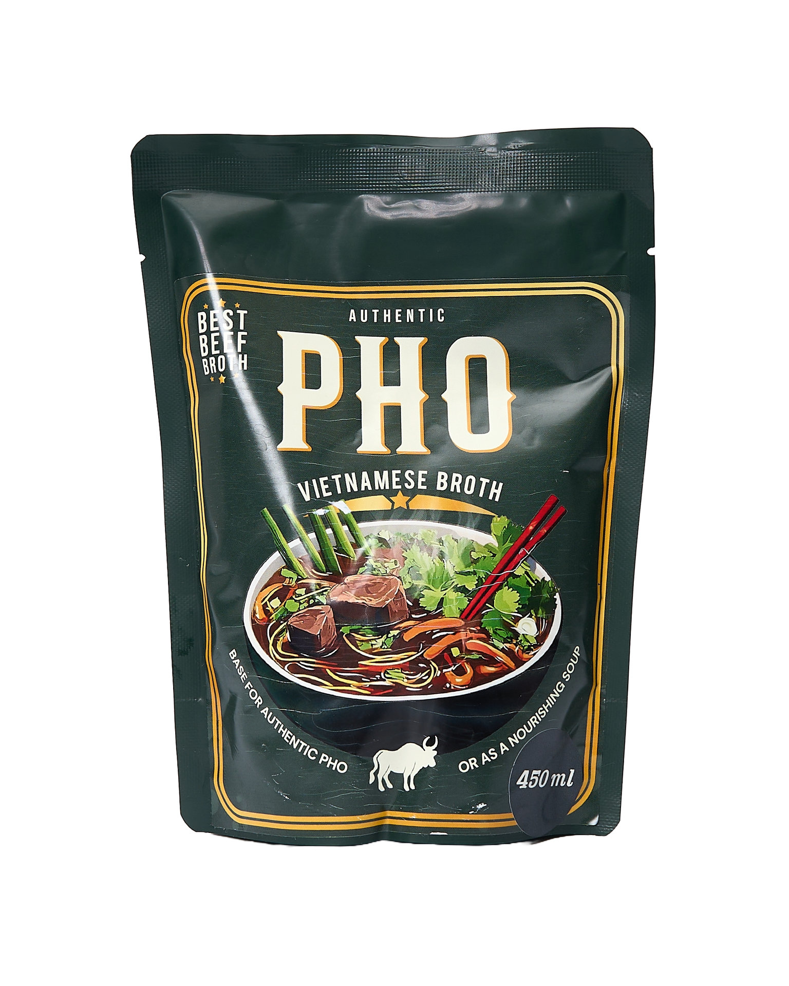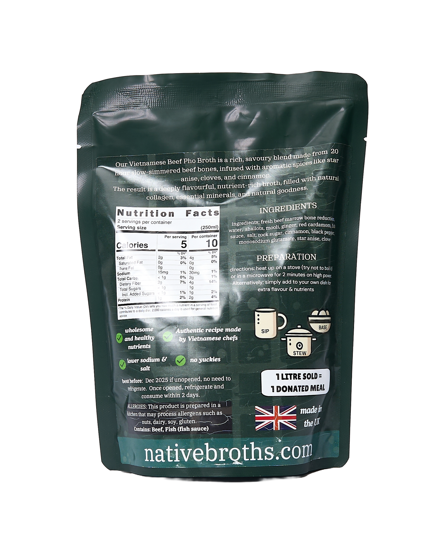 A nourishing, slow-simmered Vietnamese beef pho broth made from the bones of grass-fed cows and aromatic spices like star anise, cloves, and cinnamon. Rich, savoury, and deeply warming, it’s lower in sodium than standard recipes and packed with natural nutrients and vitamins. Serve hot in a 250ml portion—just gently heat without boiling. Of course, also make an easy, delicious pho at home. Alcohol-free.