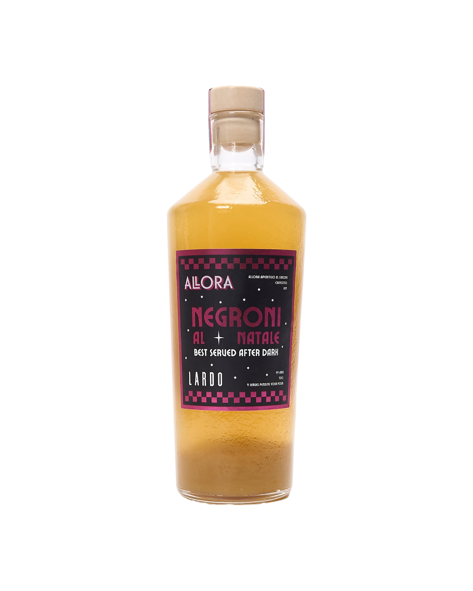 Allora's 'Negroni al Natale' is a premixed Italian Christmas cocktail that celebrates the playful side of festive indulgence. This deliciously tempting creation blends Lardo's homemade chinotto with Allora Aperitivo al Limone and East London Liquor gin for a sophisticated holiday treat. They recommend serving it over ice, where it shines brightest amid the sparkle of mirrorballs and rainbow confetti. Perfect for evening celebrations that stretch into memorable nights, this cocktail captures the spirit of Italian holiday revelry in every sip. Buon Natale e Salute! ABV: 19.0%