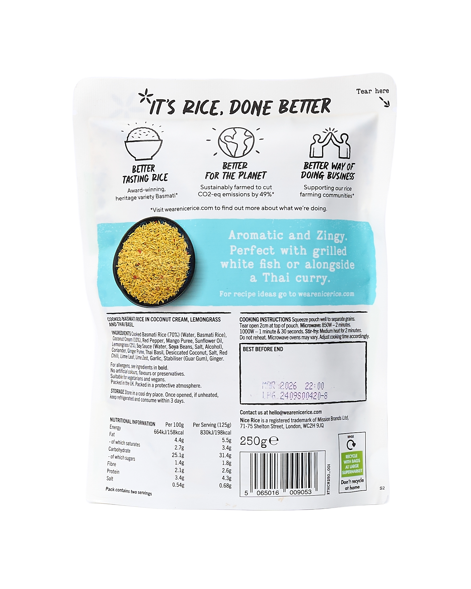 Nice Rice's Coconut & Lemongrass ready to eat rice is made by cooking their Great Taste Award-winning pure Basmati with coconut, lemongrass, and lime leaf. Beautifully balanced and aromatic, it is perfect with a Thai green curry or simply served alongside pan-seared fish. This ready-to-eat rice is perfect for a lazy but delicious meal!