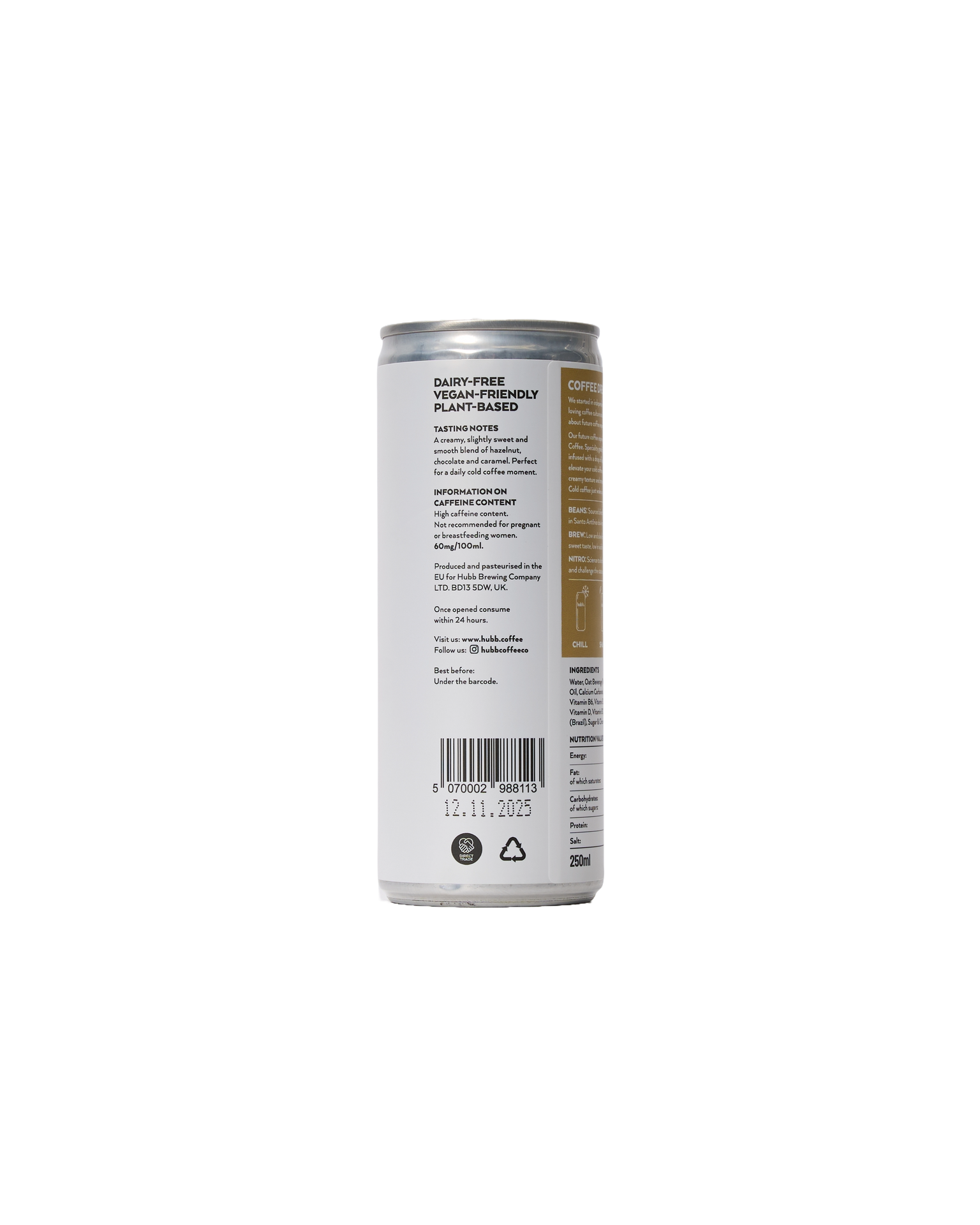 The modern classic: Oat Flat White. Made with specialty Brazilian coffee and creamy, plant-based oat milk, it offers a smooth, slightly sweet blend of hazelnut, chocolate, and caramel. With 100% natural ingredients and just 75 calories per can, it’s a delicious, guilt-free vegan pick-me-up.