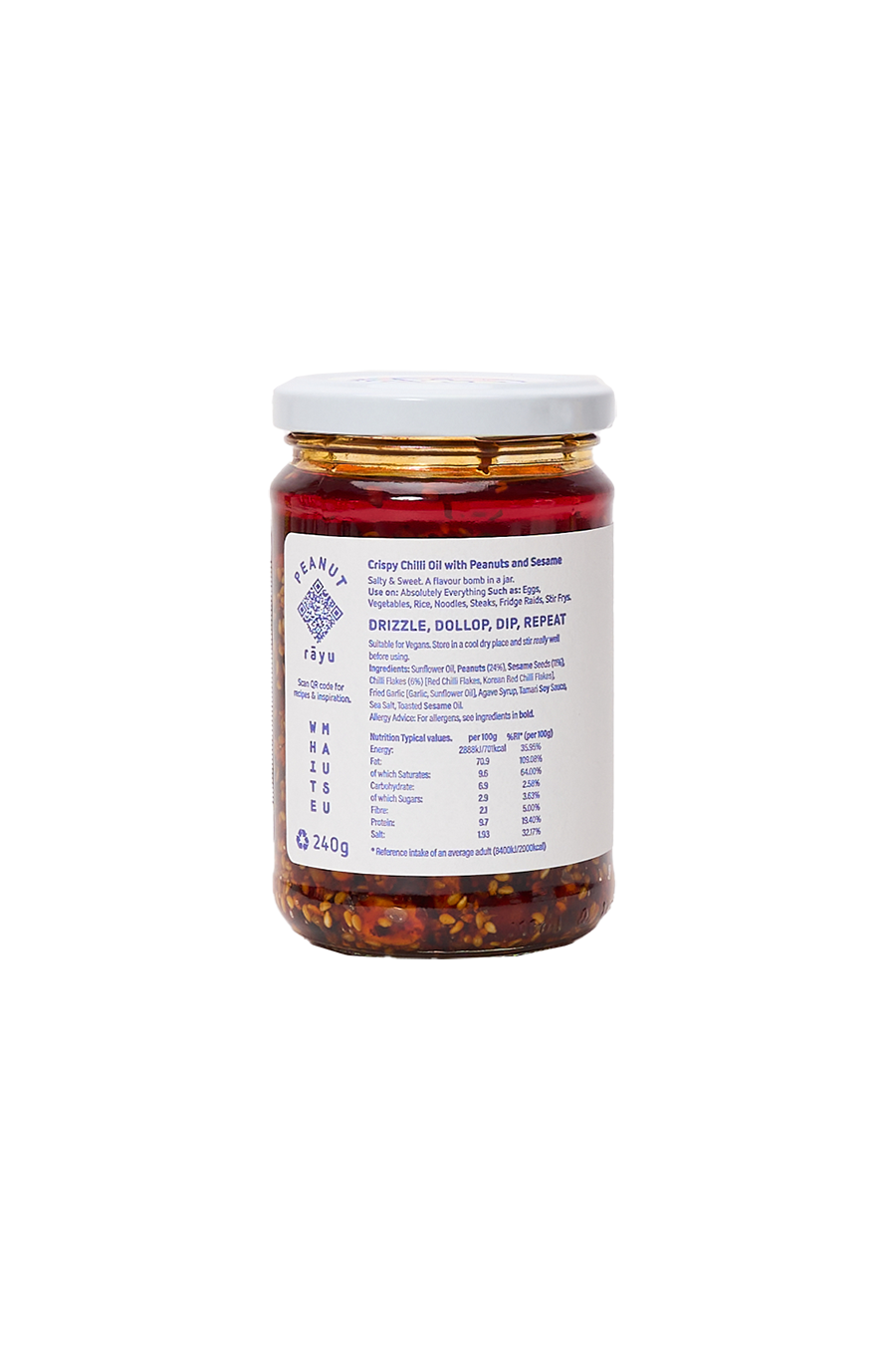 White Mausu's beloved signature sauce brings together the perfect balance of heat, crunch, and flavor. They start by gently frying garlic until crisp, then roast peanuts and sesame before blending in gochugaru and their house-blend of spices. With agave adding sweetness and tamari bringing salty depth, they've crafted a versatile everyday sauce that elevates nearly every meal.