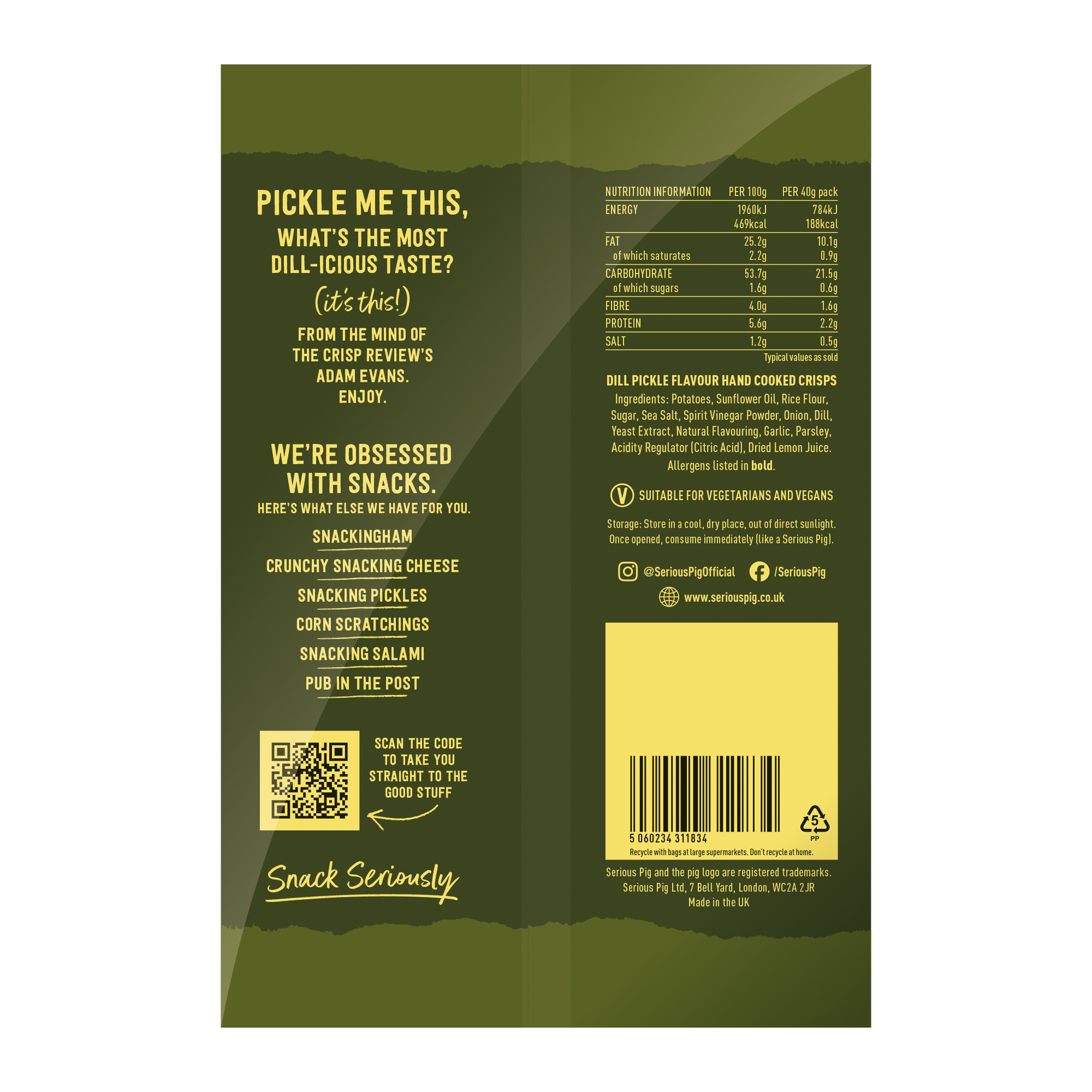 Hand cooked in Yorkshire in small batches, these crisps from Serious Pig are absolutely dill-icious. They're tangy and refreshing, with the distinctive herbaceous lift of dill, balanced by the sharpness of pickling spices. Well paired with light lagers, G&Ts, Reislings and vodka with a twist. Suitable for Vegetarians and Vegans.