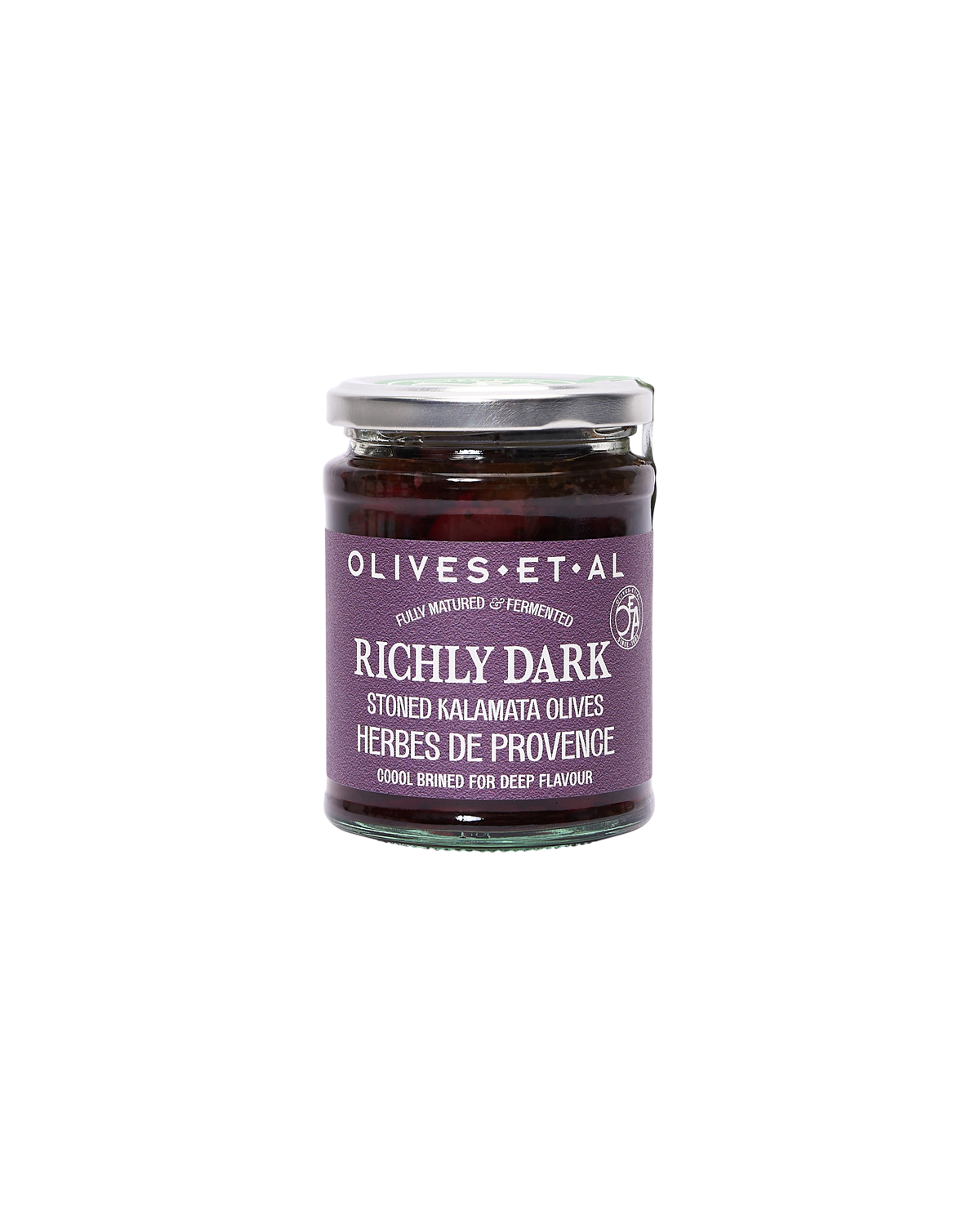 Olives Et Al started life thirty years ago after a motorbike trip through the Mediterranean. These Pitted Kalamata olives are naturally marinated in Extra Virgin Olive Oil with Herbes de Provence. They are darkly rich in colour and have been fully matured for full flavour. Try them with a squeeze of fresh orange juice.