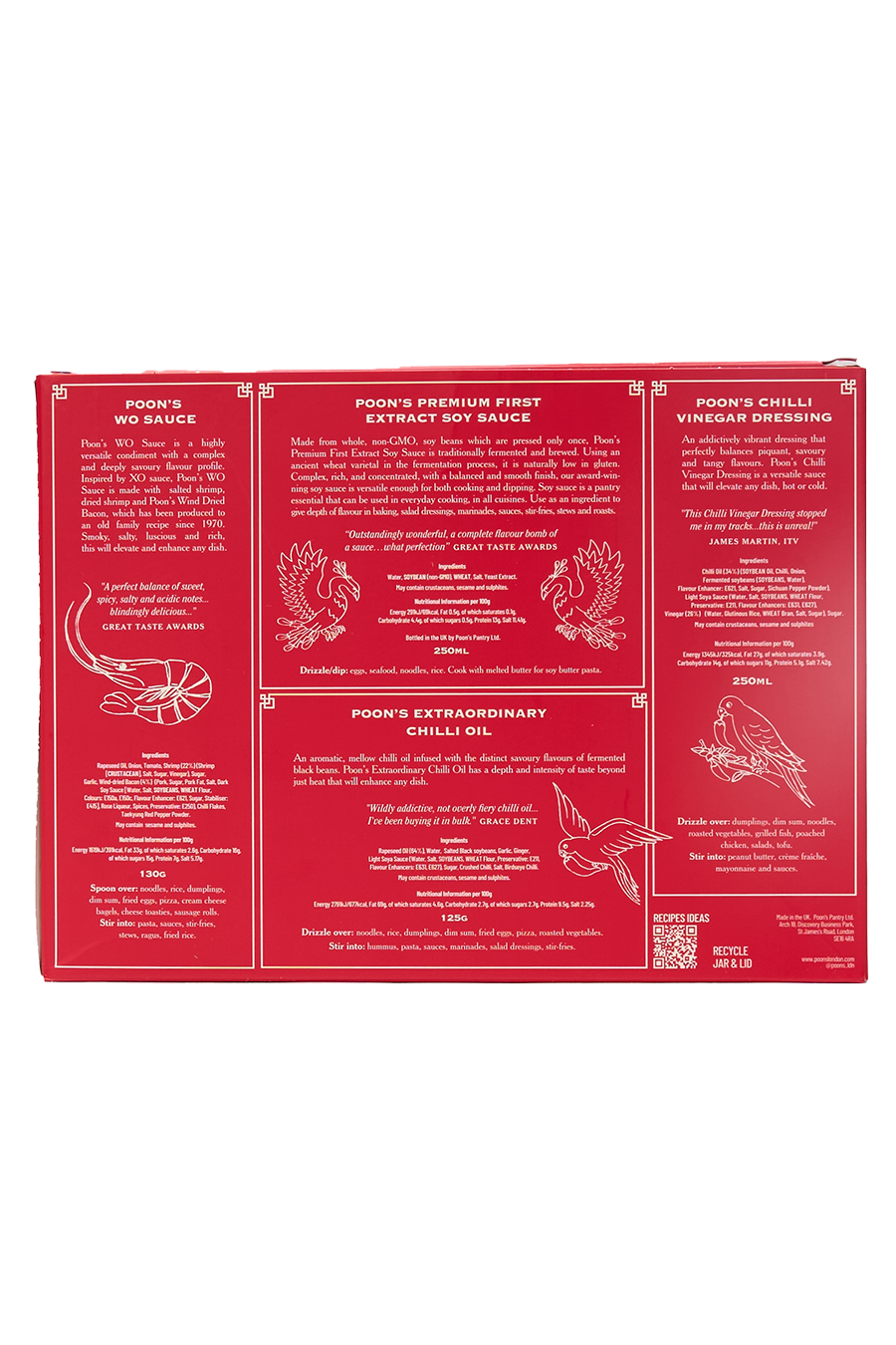 Family lies at the heart of Poon’s London, first opened as a restaurant in 1973 by chef-restaurateur Bill Poon and now overseen by his daughter Amy. This four-piece gift set is an ideal present for any condiment lover, showcasing the bold, complex flavours Poon’s is known for. Inside you’ll find their award-winning Extraordinary Chilli Oil, a fragrant and fiery staple; the rich and umami-packed Premium First Extract Soy Sauce; the salty shrimp WO Sauce; and the spicy-sour Chilli Vinegar Dressing, ideal for lifting dumplings, noodles, and salads.
