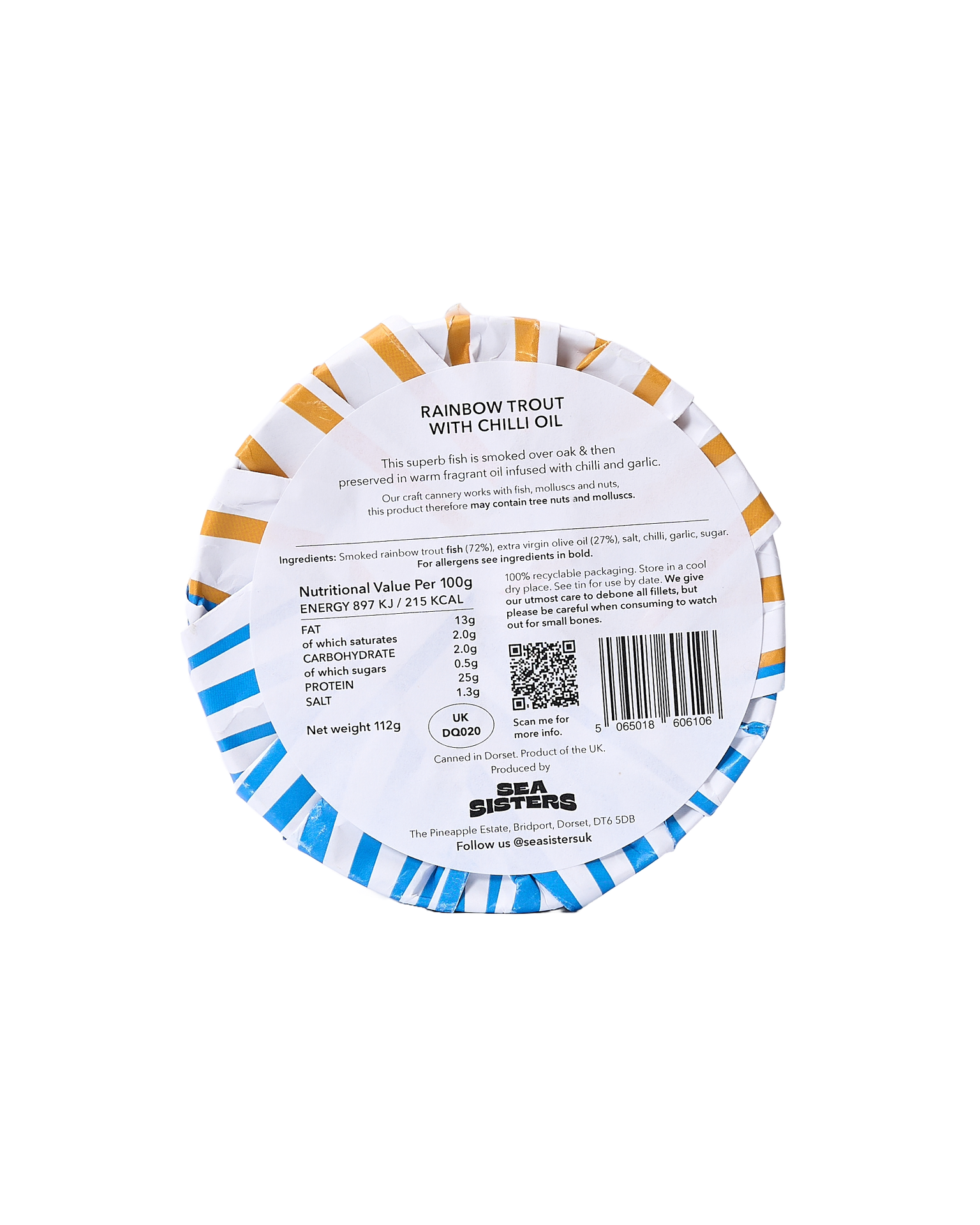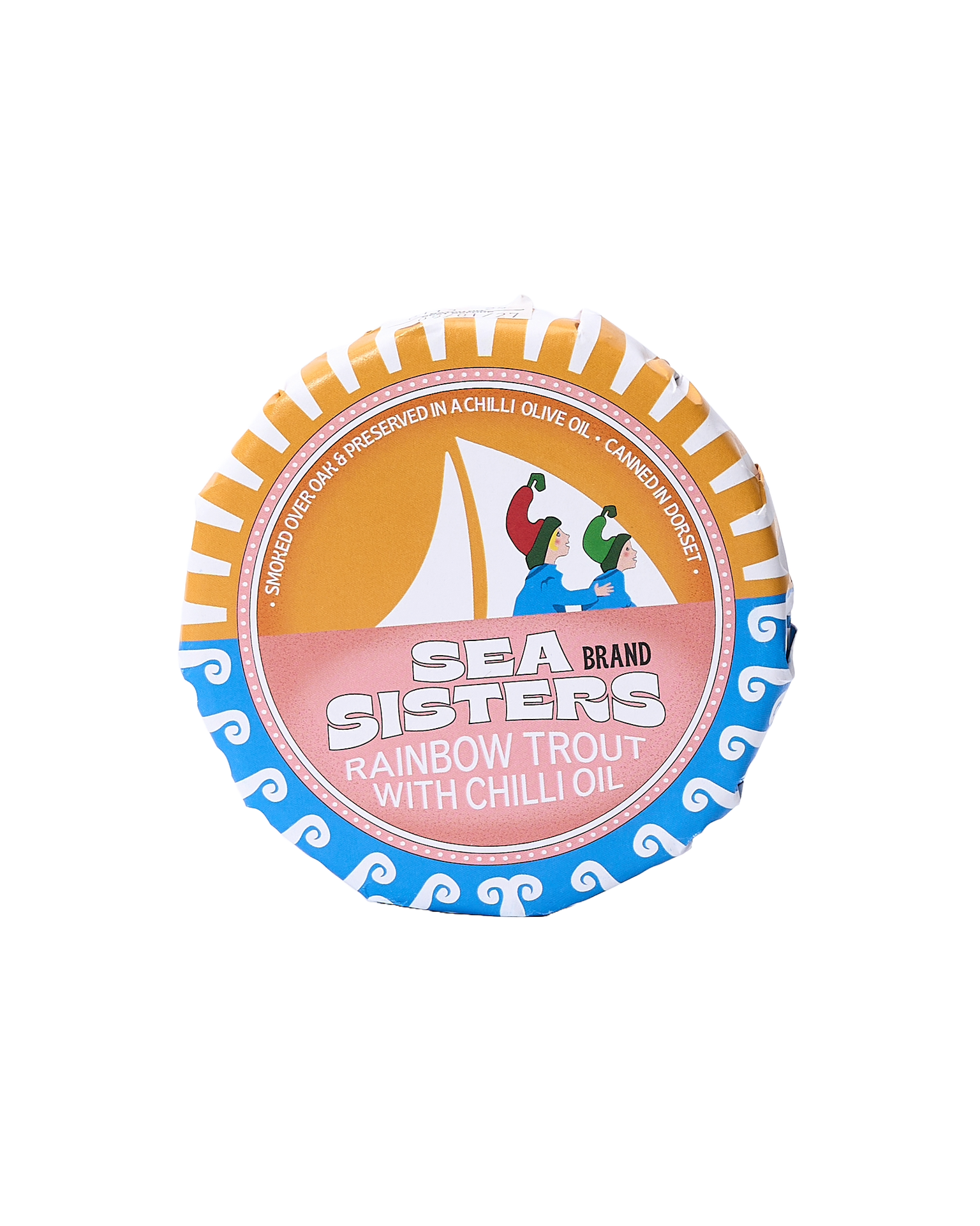 Sea Sisters' products are all sustainably sourced, and produced by hand in small batches in Dorset. This Special Edition rainbow trout is gently smoked over oak, then preserved in a warm chilli-infused extra virgin olive oil for a subtle kick that lets the fish shine.