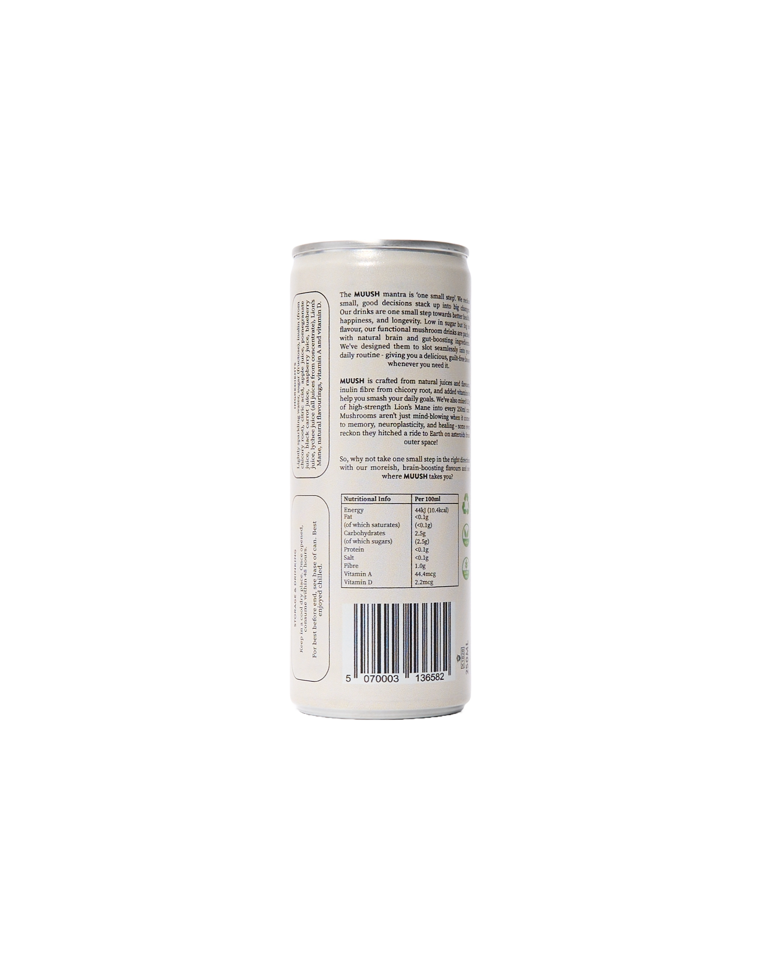 MUUSH cans make it easy to enjoy the benefits of Lion’s Mane. There’s no earthy mushroom taste— just a blend of natural fruits, roots, botanicals and sparkling water. Blueberries and raspberries meet the tropical twist of lychee, with a light, refreshing fizz. Support focus and gut health, without the sugar crash.