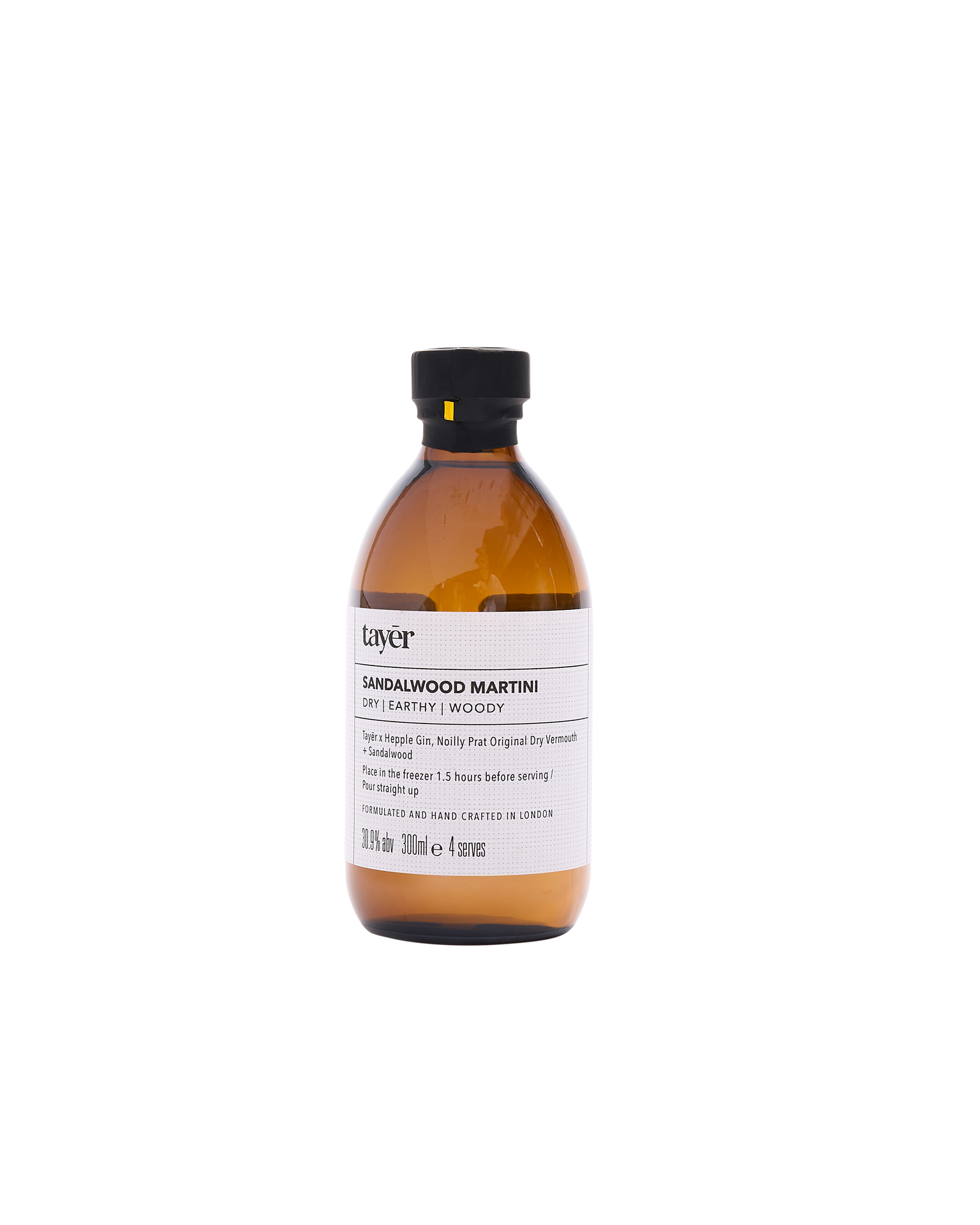 Bottled cocktail brand Tayēr RTD is part of the London cocktail bar Tayēr + Elementary. This ready-to-drink sandalwood martini cocktail comes in a bottle housing four servings. It has notes of citrus and wood. Serve from the freezer in a frozen martini glass. ABV: 30.9%.