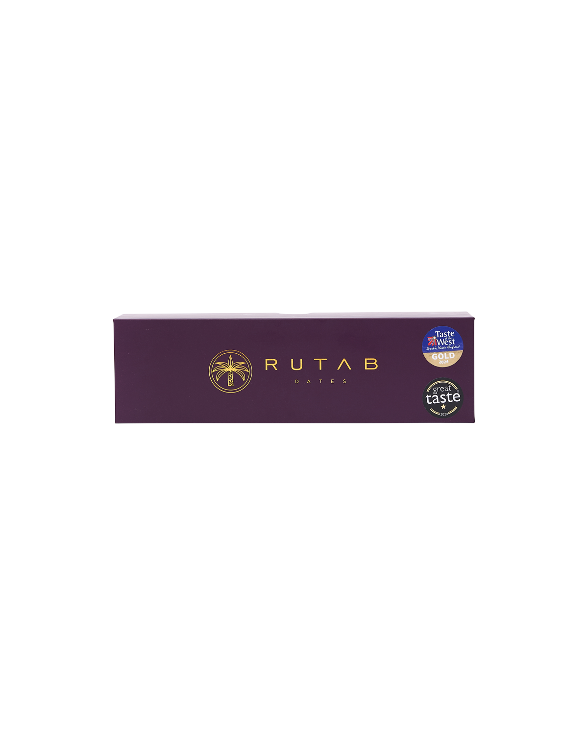A gift box with an assortment of six flavoured, stuffed Medjoul dates. Rutab's toffee-like, sweet Jordanian Medjool Dates are stuffed with indulgent fillings, then coated in hand-tempered Belgian chocolate. Each date is then decorated with a distinctive topping. They're a perfect, balanced sweet treat, showcasing the finest sweet fruit nature has to offer.