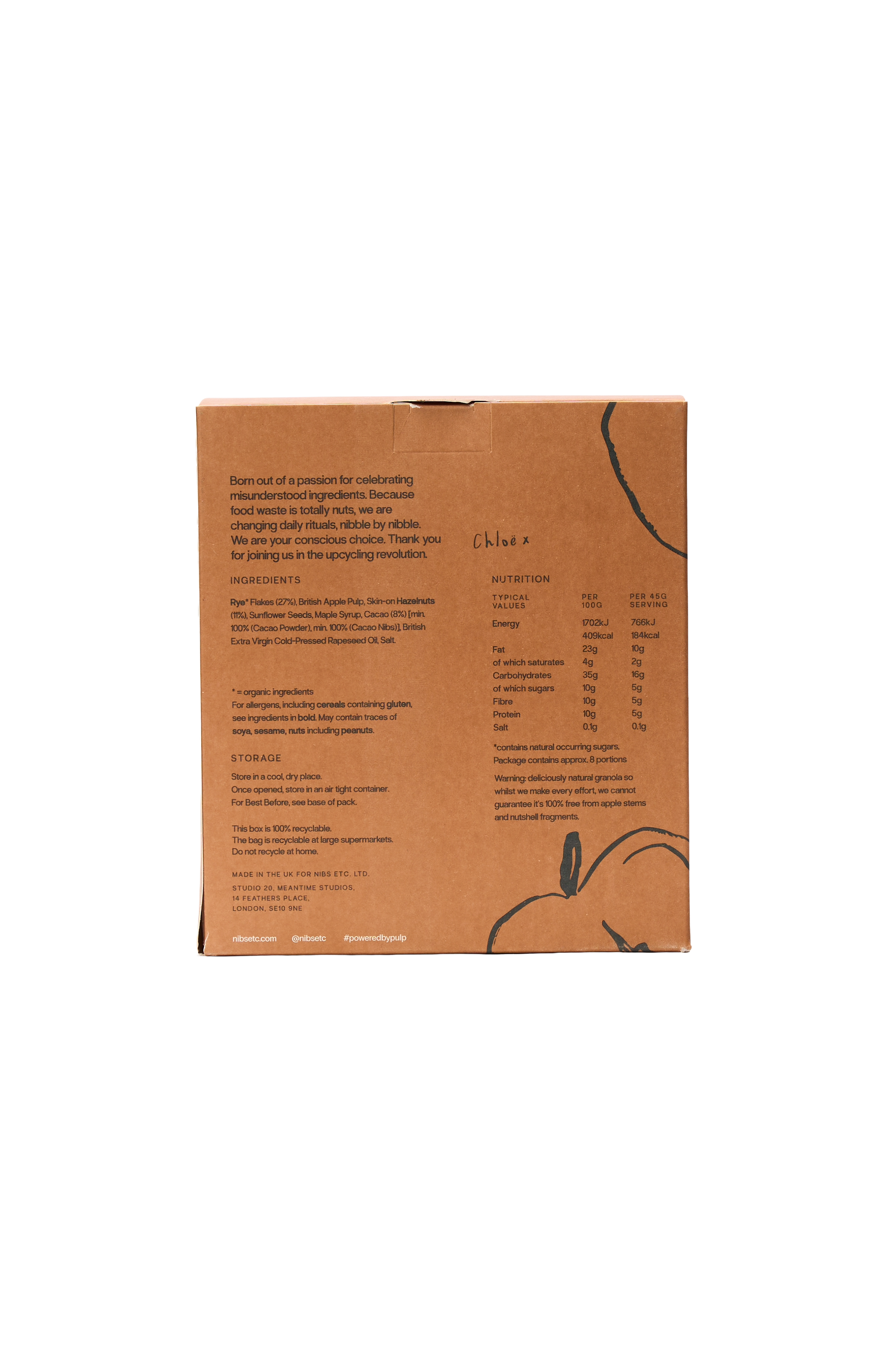 NIBS ETC. DARK CHOCOLATE GRANOLA: Granola made from upcycled ingredients, with a rich dark chocolate flavour and no added sugar. Serve with yoghurt, milk, or use as an ice cream topping. 450g