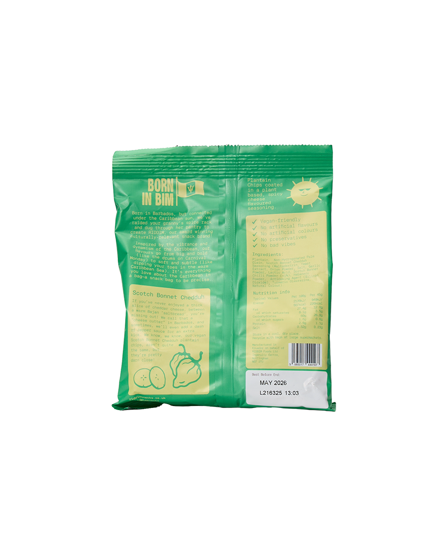 These vegan-friendly crisps channel Bajan charm with spicy Scotch bonnet heat and savoury chedduh-style flavour—a cheeky nod to the island’s famous “cheese cutter” sandwich. Crafted with natural ingredients, they deliver bold, addictive crunch in every bite—no dairy required.