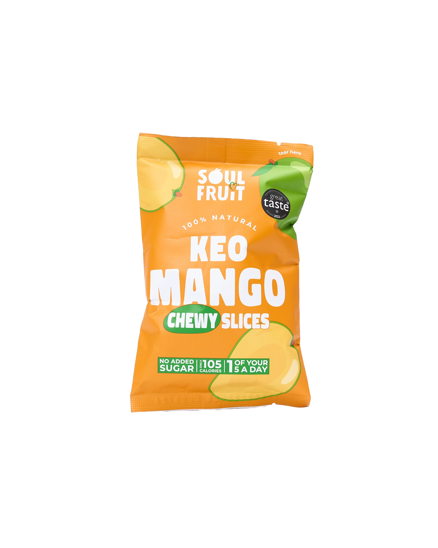 Soul Fruit's signature soft dried Mango. These snacks are a perfect balance of sweetness & sourness, made using the ripest and juiciest Keo Mango. Soft dried to perfection, the chewy dried fruit snacks are jam-packed with tropical flavour and nutrition. It's the perfect pick-me-up to satisfy those sweet cravings for a healthy snack. They are 1 of your 5 a day and high in fibre as well as being vegan and gluten free.