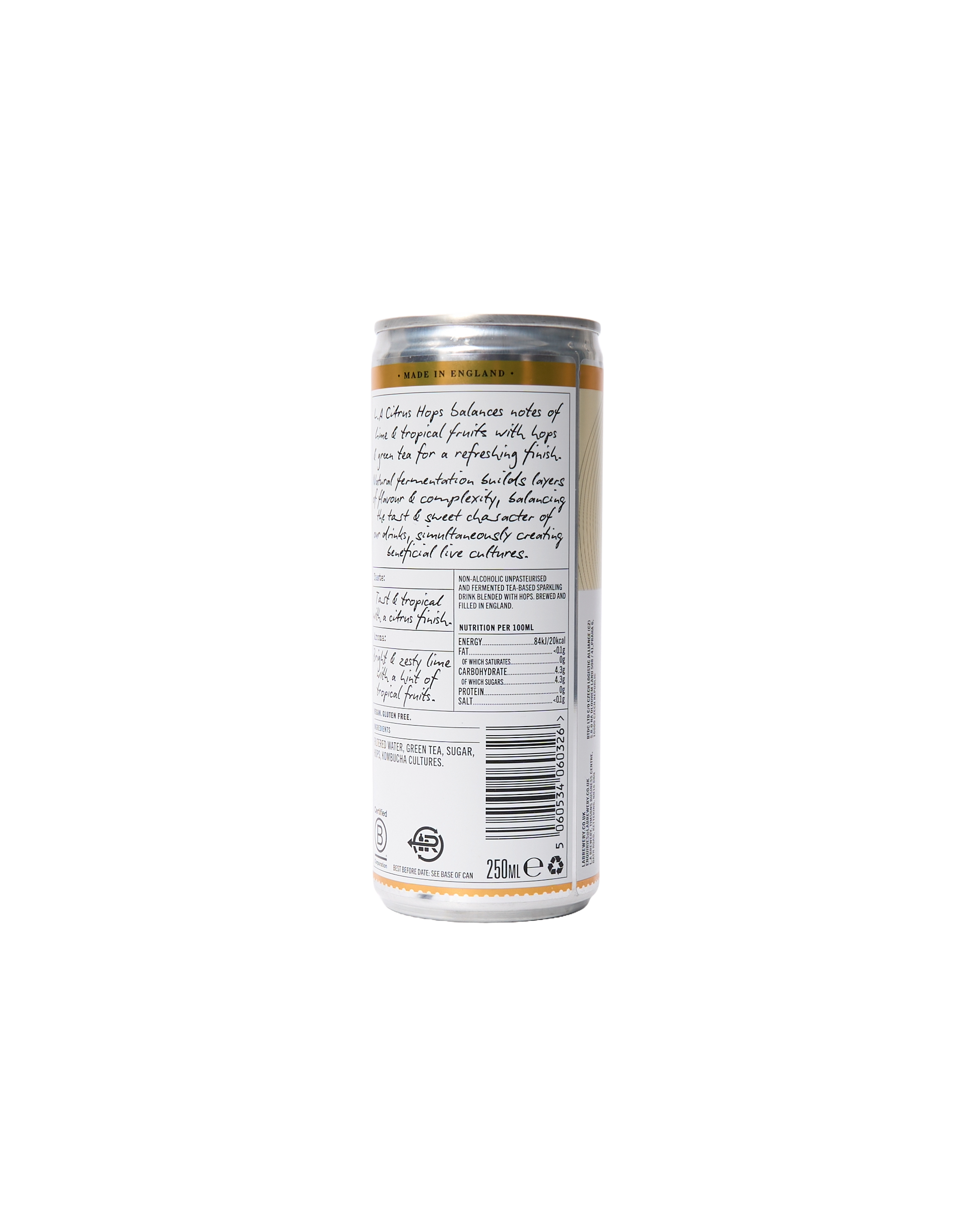 Citrus Hops blends zesty lime and tropical fruit notes with hops and green tea, delivering a bright, refreshing finish. Naturally fermented, it develops layered flavours and complexity—balancing tartness and sweetness while creating beneficial live cultures. Its crisp profile cuts through rich, heavy dishes like red meats and BBQ foods, making it a perfect pairing.