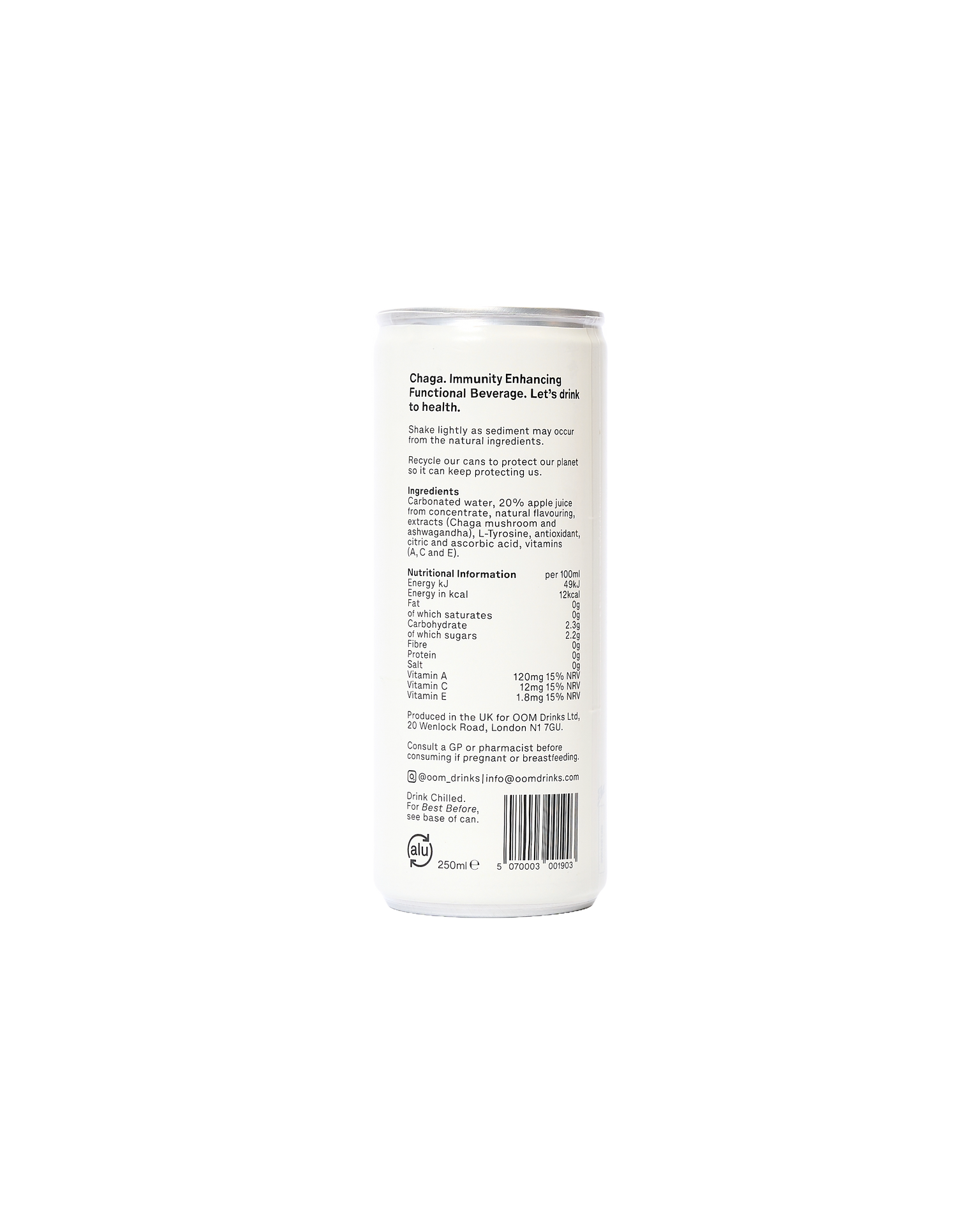 OOM is a lightly sparkling functional beverage, infused with 750mg of fresh Chaga mushroom, a powerhouse of antioxidants, plus vitamins A, C, & E, Ashwagandha, and L-Tyrosine, it invigorates your senses while strengthening your immune system. A perfect balance of wellness.