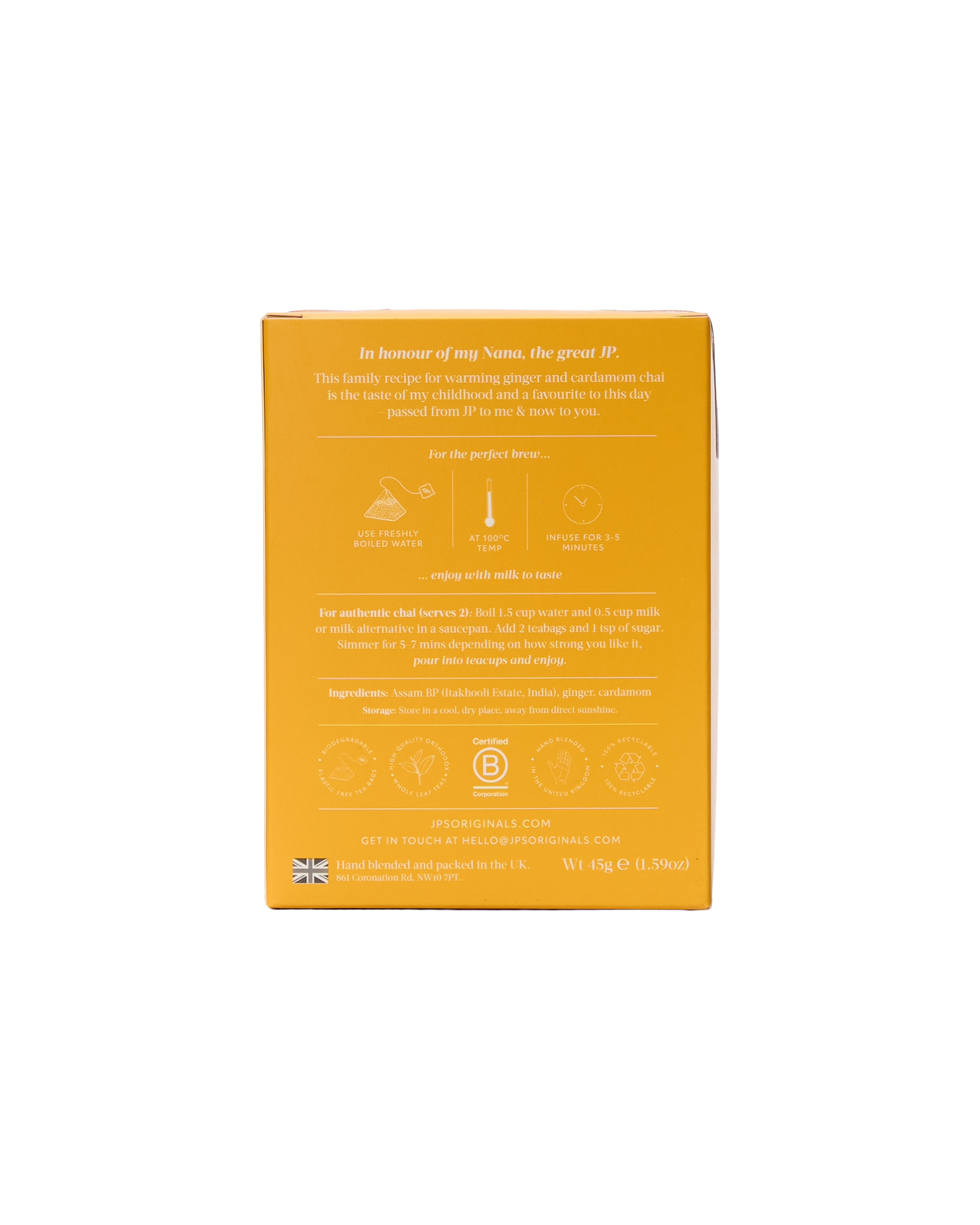 A warming spiced chai with fiery ginger and sweet cardamom, this beloved family recipe captures the comforting flavours of childhood and tradition. Crafted with broken pekoe tea leaves for a deep, brisk finish, and enriched with ginger root for its immune-boosting, anti-inflammatory benefits. Includes 15 plastic-free pyramid bags.