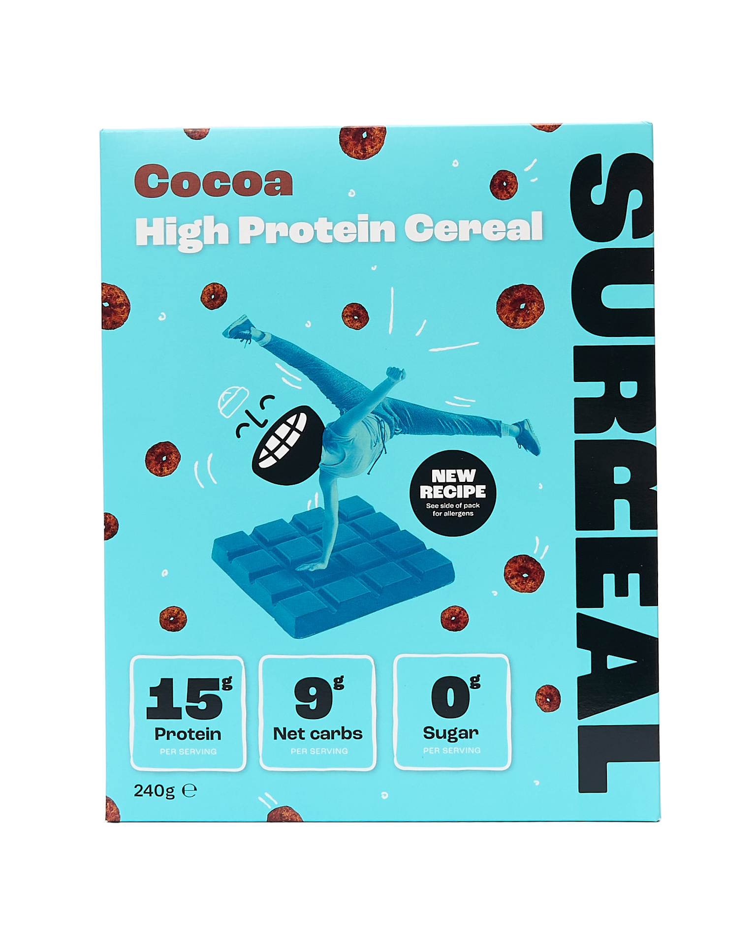 SURREAL creates cereal that tastes like the ones you loved as a kid, but revamped with less sugar, more protein, and fewer carbs. A rich, chocolatey cereal packed with protein and naturally sweetened, without the sugar crash. The deep cocoa flavour balances beautifully with the crunch of soya hoops. Pour over milk for a classic pairing or snack on them dry.