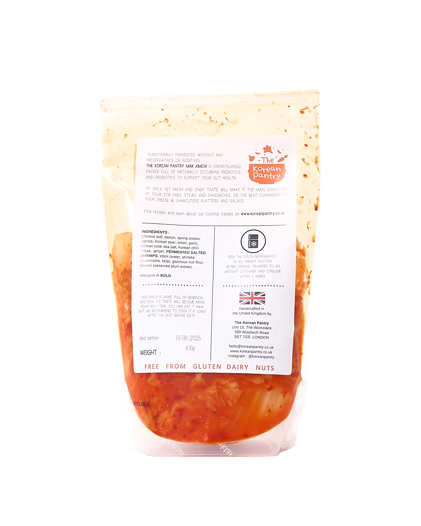 Chinese Leaf, Daikon, Spring Onion, Carrot, Onion, Garlic, Ginger, Korean Pear, Korean Chilli Pepper Flakes, Fermented Shrimps, Glutinous Rice Flour, Dried Shiitake Mushroom, Kelp, Fermented Korean Plum Extract, Korean Solar Sea Salt.