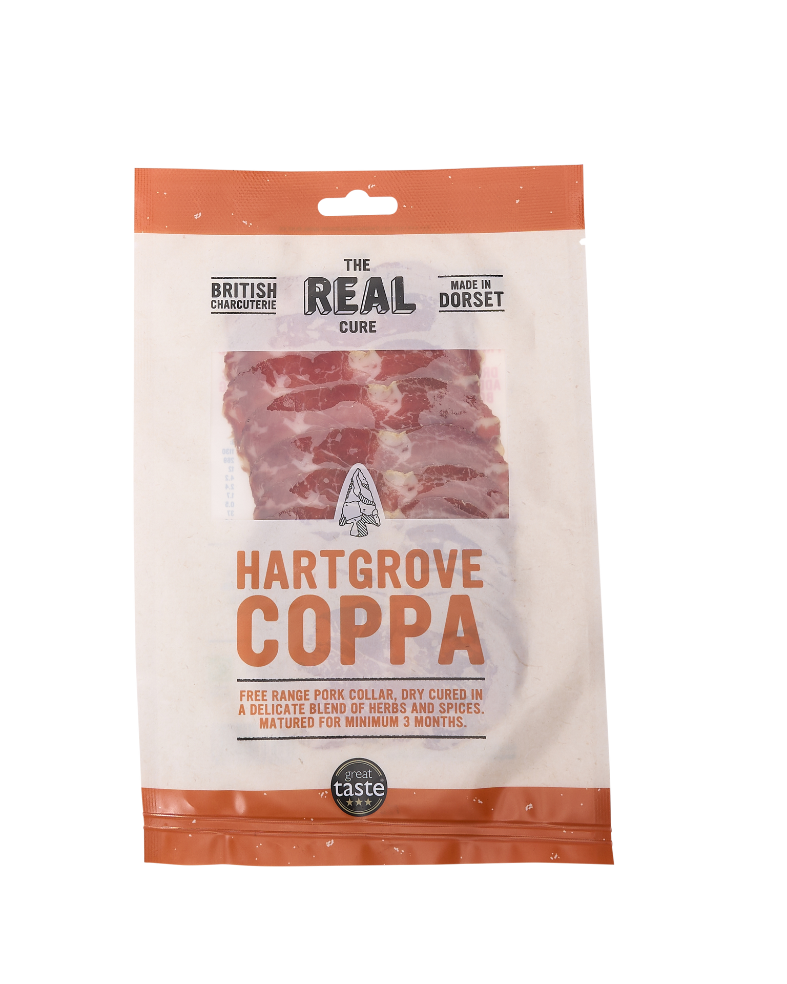 The Real Cure is a Dorset-based brand crafting artisanal British charcuterie using traditional curing methods and sustainably-sourced British meat. Their Hartgrove Coppa is a premium cured meat made from free-range British pork collar, dry cured in a blend of herbs and spices, and air dried for three months. It offers a tender texture and rich, savoury flavour with a hint of natural sweetness. Serve it on a charcuterie board, alongside crusty bread and cheese, wrapped around asparagus spears, or in salads and sandwiches.