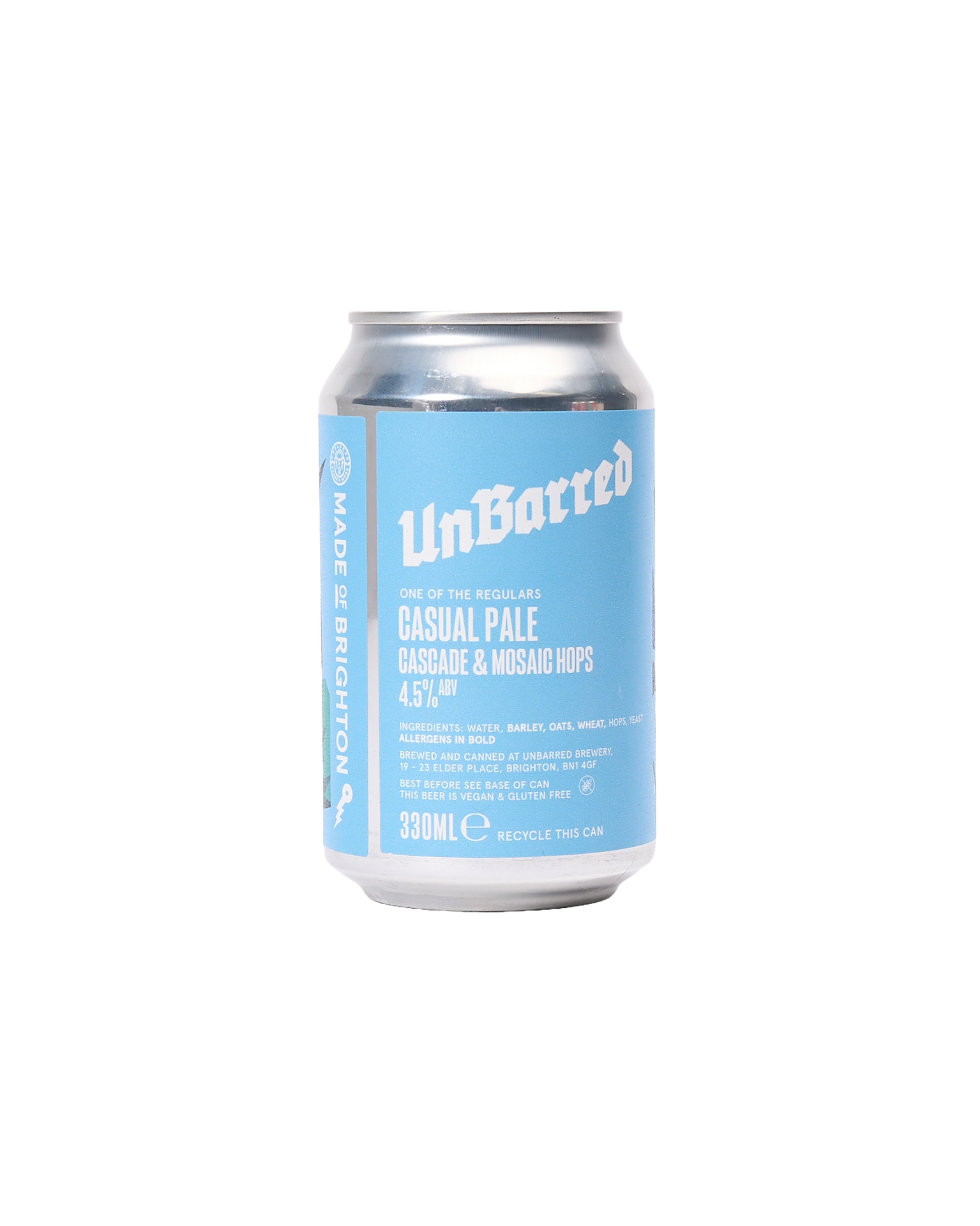 UnBarred Brewery in Brighton & Hove brews award-winning beers, embracing the city’s creative energy and bold collaborations to “Be UnBarred” in everything they do. Casual Pale is a crisp, clean pale ale with a soft mouthfeel and refreshing citrus hop aroma—perfect for sharing with good friends and great food. Brewed with Cascade and Mosaic hops, it brings light pine, citrus, and floral notes to every sip and is both gluten-free and vegan-friendly. ABV: 4.5%.